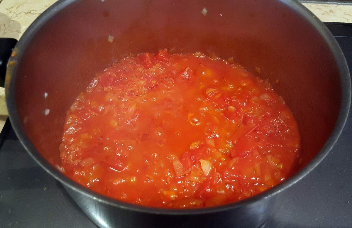 1) Peler et hacher finement l'oignon. Dans une casserole, le faire revenir 2 minutes sur feu moyen-vif dans un filet d'huile d'olive. Ajouter 300g de coulis de tomates ou de tomates concassées et à l'ébullition, baisser sur feu moyen. Laisser mijoter 3 minutes.
