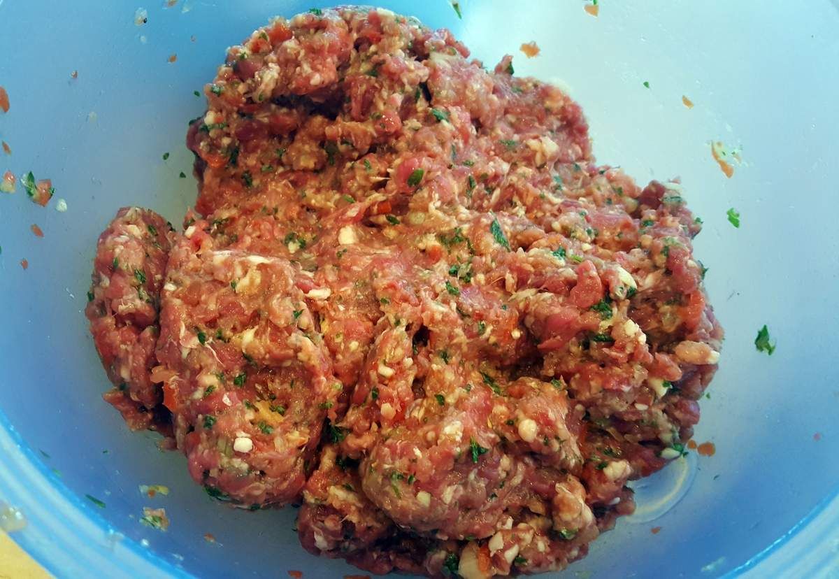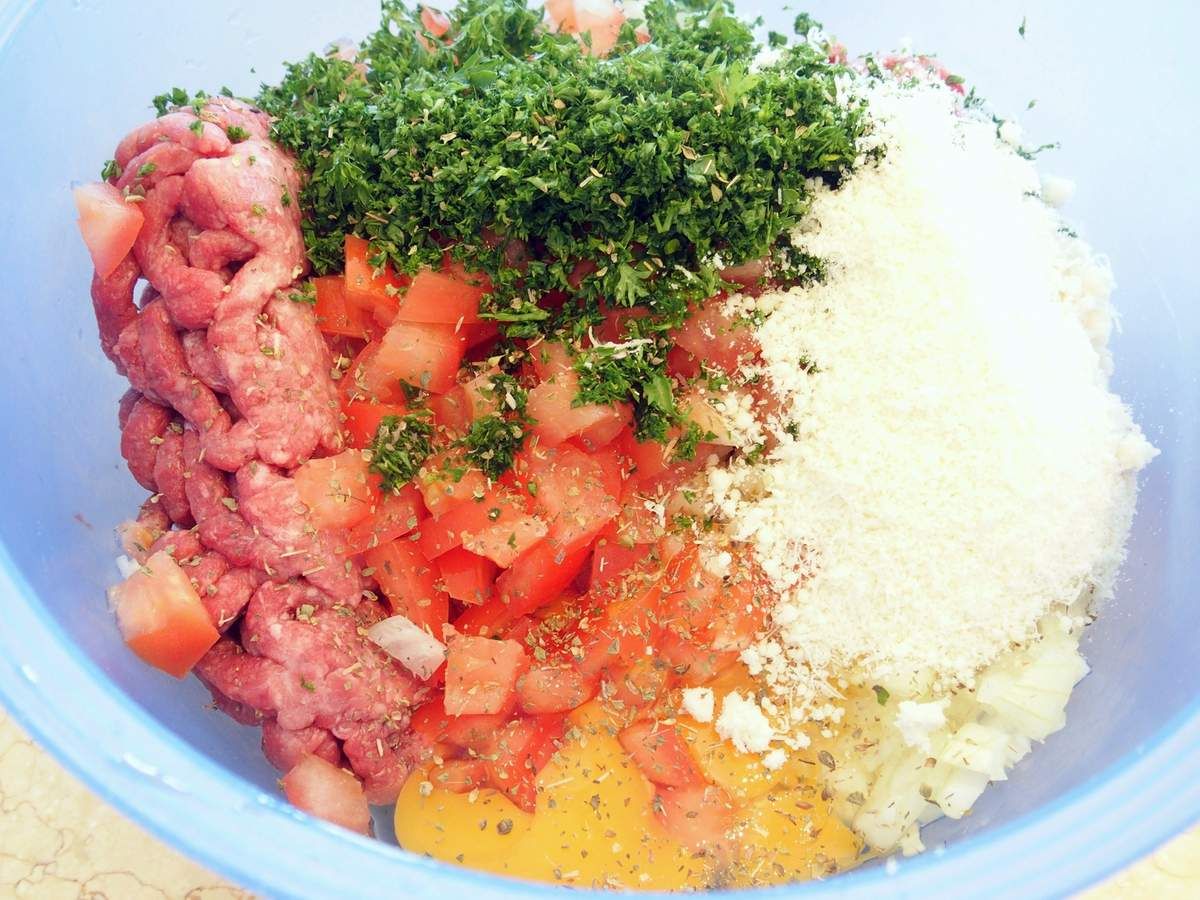 3) Préparer la farce à cannelloni: hacher l'oignon et l'ail finement. Hacher le persil. Couper la tomate en tout petits dés. Mettre tous ces ingrédients dans un plat avec la viande hachée, les oeufs et 2 càs de parmesan. Poivrer. Ajouter une bonne càc de sel et un peu d'origan séché. Bien mélanger.