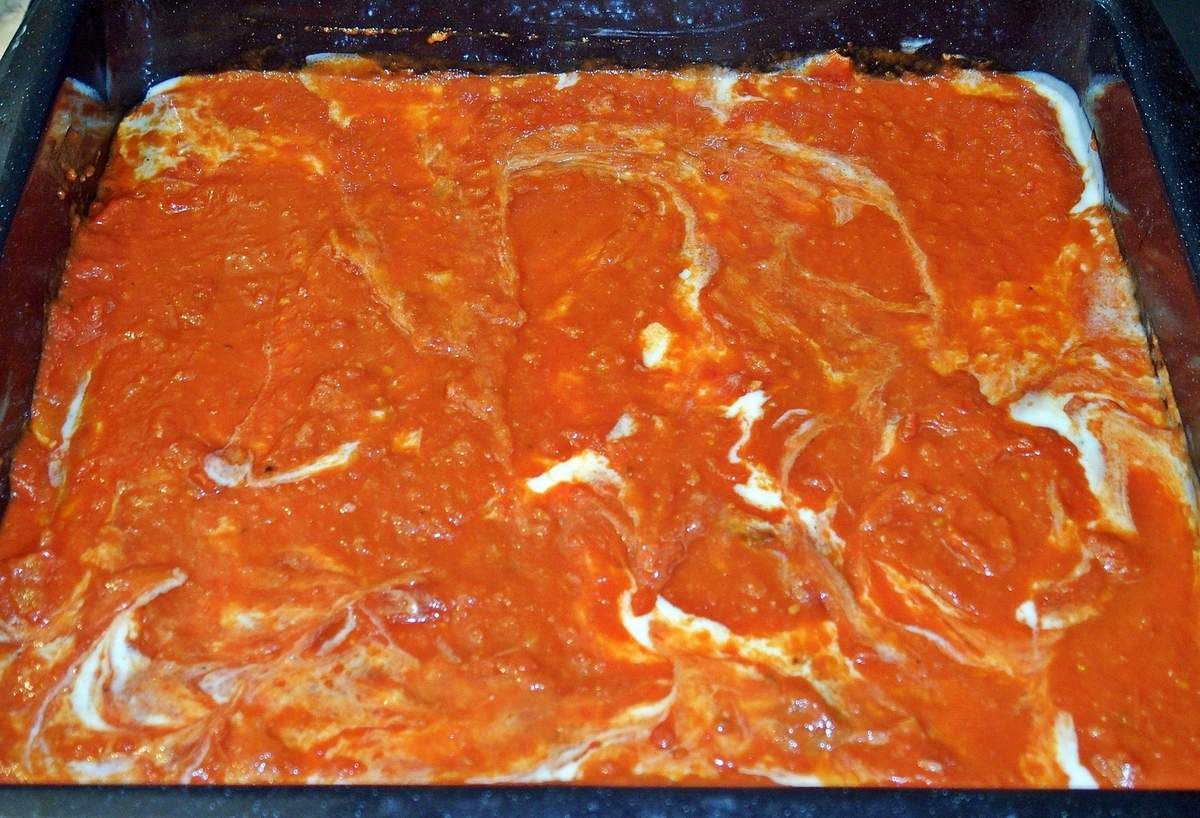 1)  Préparer la sauce tomate: hacher l'oignon et les gousses d'ail. Les faire revenir dans un filet d'huile d'olive dans une casserole. Ajouter les tomates concassées, une pincée de sucre, du sel et du poivre et une 1 càs d'huile d'olive. Laisser mijoter à découvert 45 minutes à 1 heure. Réserver et laisser tiédir.