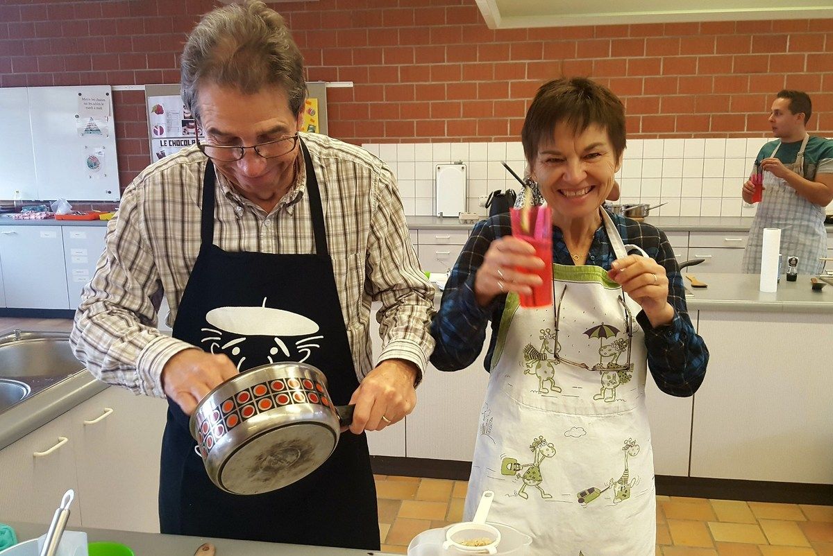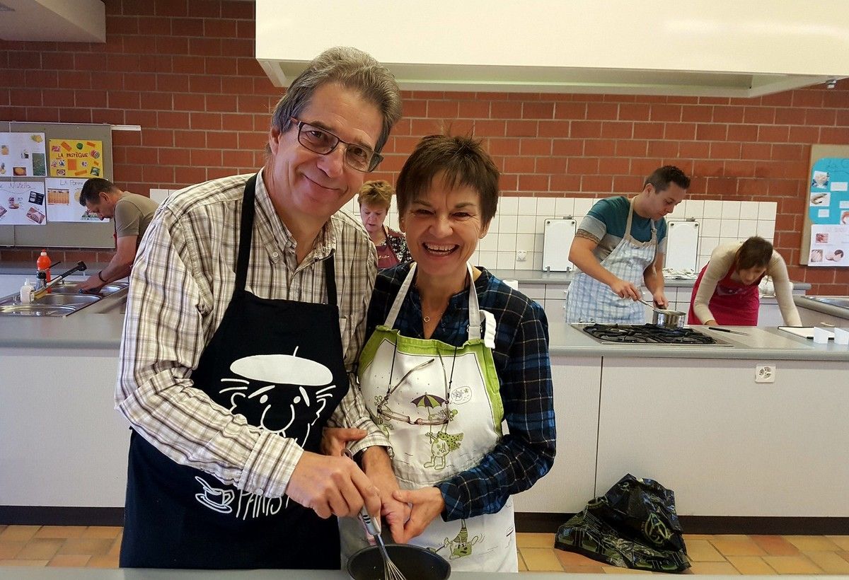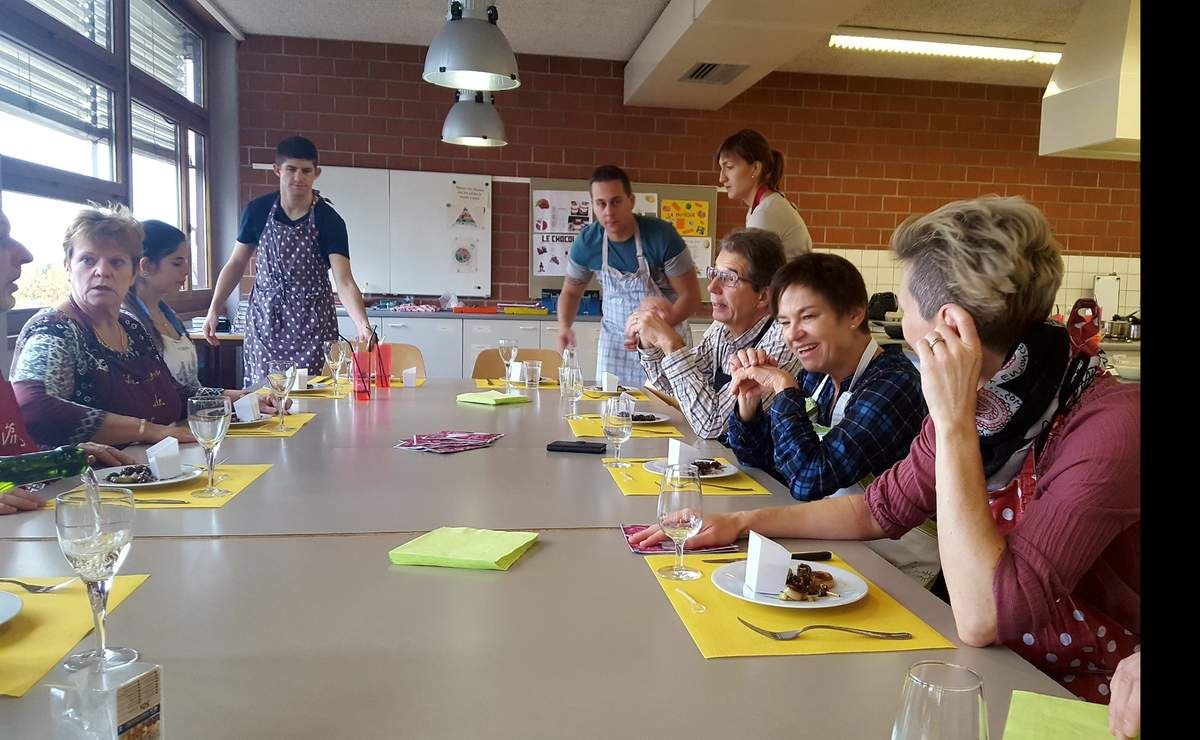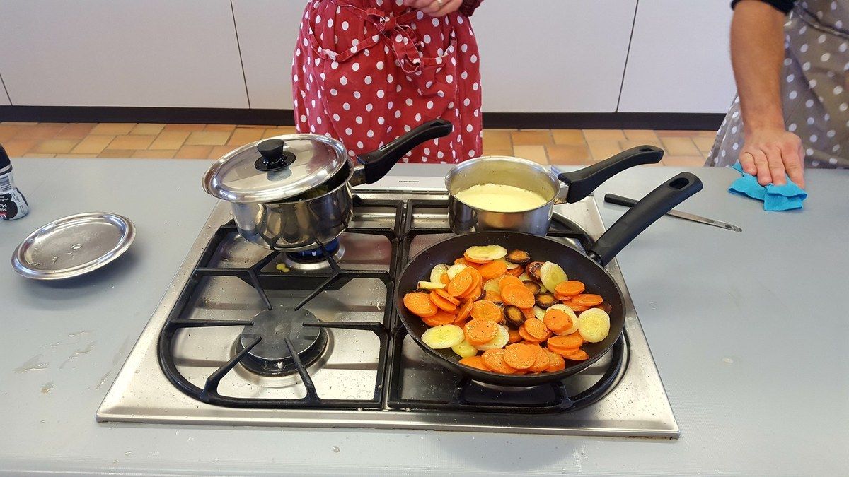 Alors là c'était vraiment top. Je fais encore un gros bec à mes 6 petits couples trop géniaux. Et à mon homme qui m'a épaulée. On a passé un moment super au cours de cuisine d'aujourd'hui. La cuisine à deux, que du bonheur. Au menu panna cotta de foie gras et coulis de fruits de la passion, coeurs de poulet teriyaki en brochettes, filets de daurade sur embeurrée de fenouil, sauce à la mandarine, filet mignon en cuisson lente, crème de truffe, purée au persil montée à l'huile d'olive et poêlée de carottes multicolores, poires pochées au vin rouge et aux épices sur crème anglaise au lait d'amandes. Du taf mais dans l'amûûûr et la bonne humeur.
