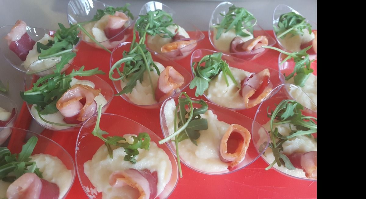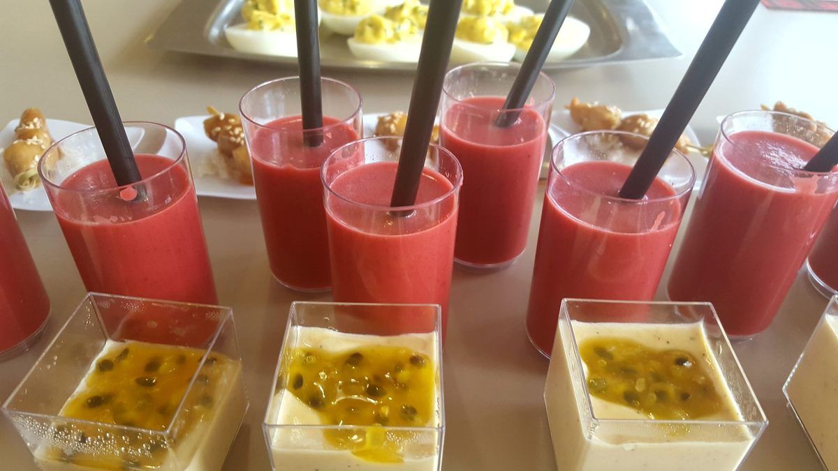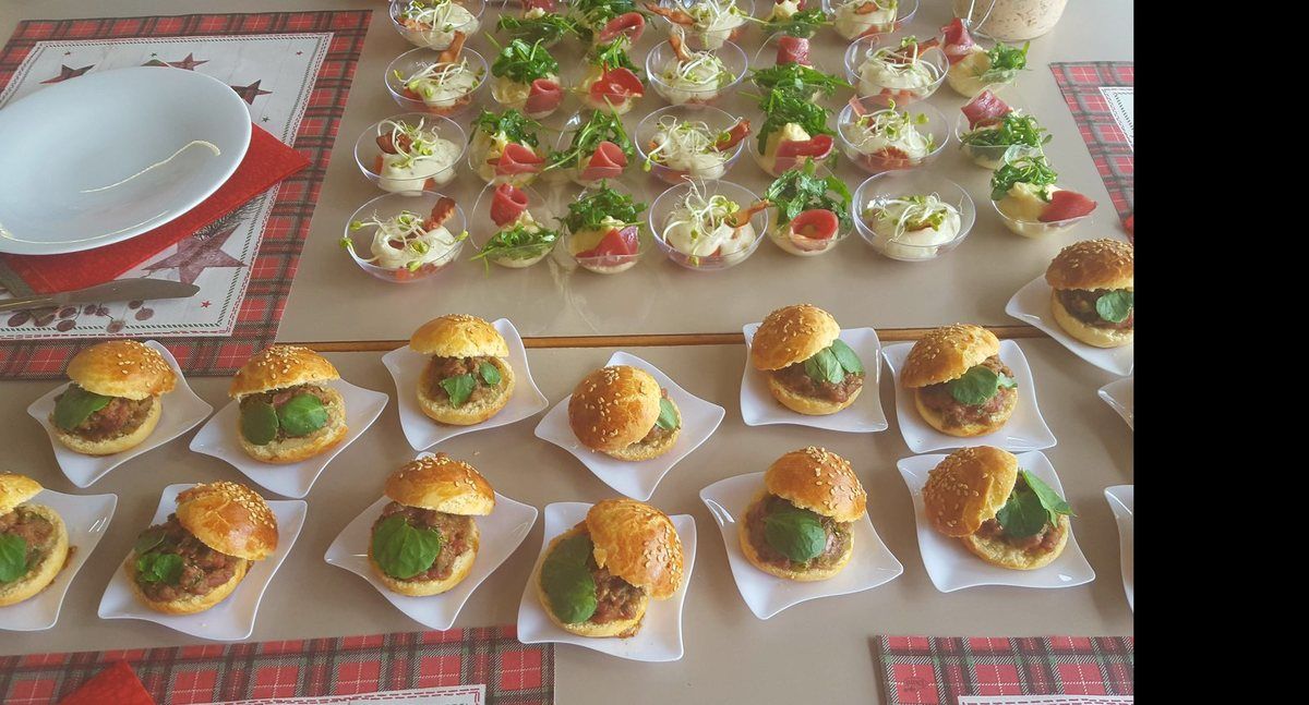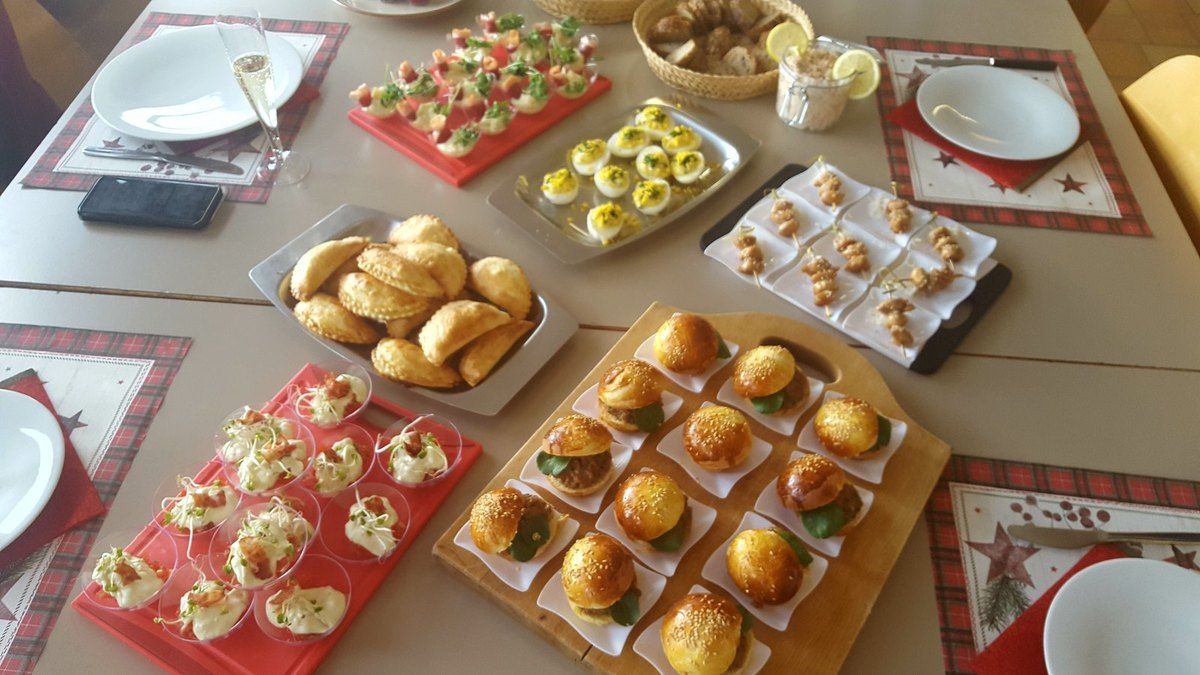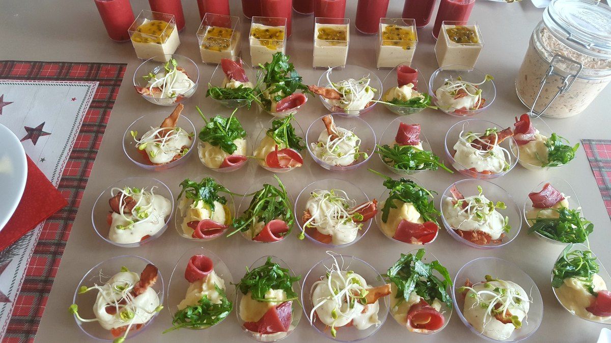 Au menu, 10 amuse-bouche: panna cotta de foie gras et coulis de fruits de la passion, crème de gorgonzola tomates et bacon, chaussons au thon et aux crevettes, soupe de betterave froide épicée au gingembre et citron vert, brochettes de sot-l'y-laisse à la japonaise, rillettes aux deux saumons, samossas exotiques au boeuf et petits pois, purée de panais avec magrets de canard fumés et roquette, minis burgers de tartare de boeuf, oeufs mimosa.