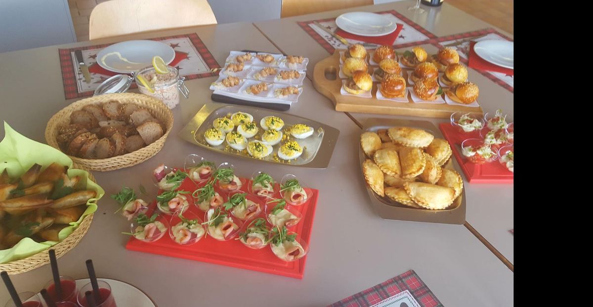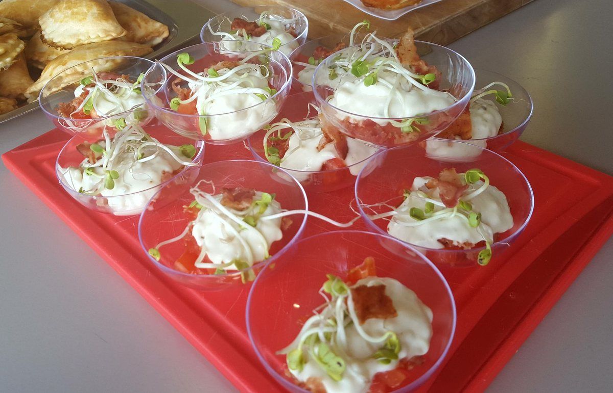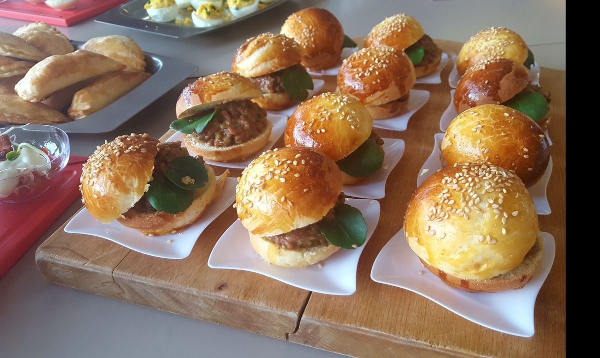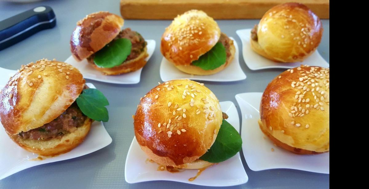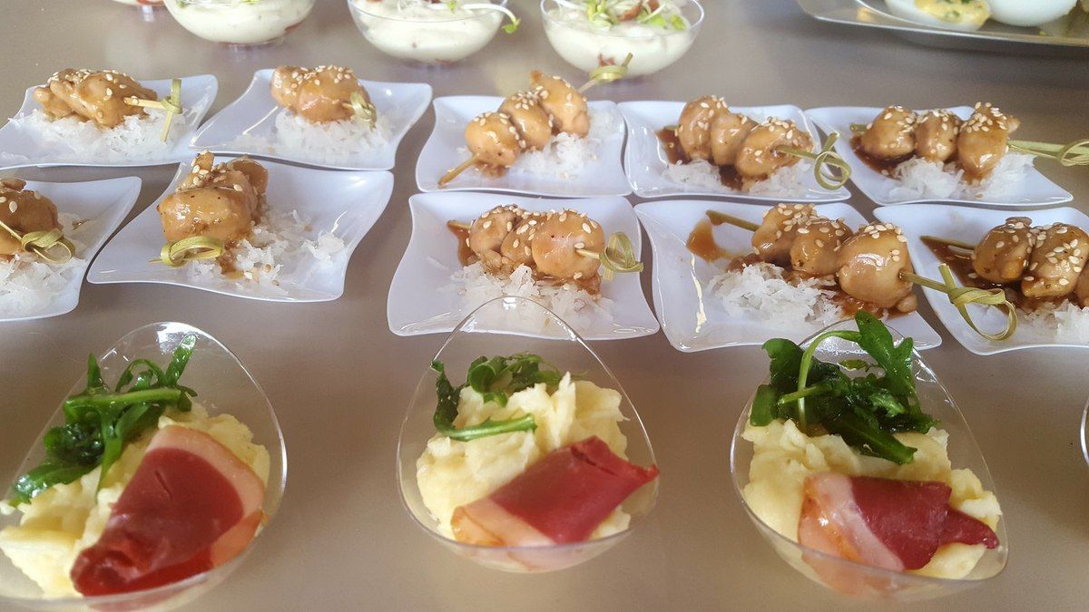 Au menu, 10 amuse-bouche: panna cotta de foie gras et coulis de fruits de la passion, crème de gorgonzola tomates et bacon, chaussons au thon et aux crevettes, soupe de betterave froide épicée au gingembre et citron vert, brochettes de sot-l'y-laisse à la japonaise, rillettes aux deux saumons, samossas exotiques au boeuf et petits pois, purée de panais avec magrets de canard fumés et roquette, minis burgers de tartare de boeuf, oeufs mimosa.