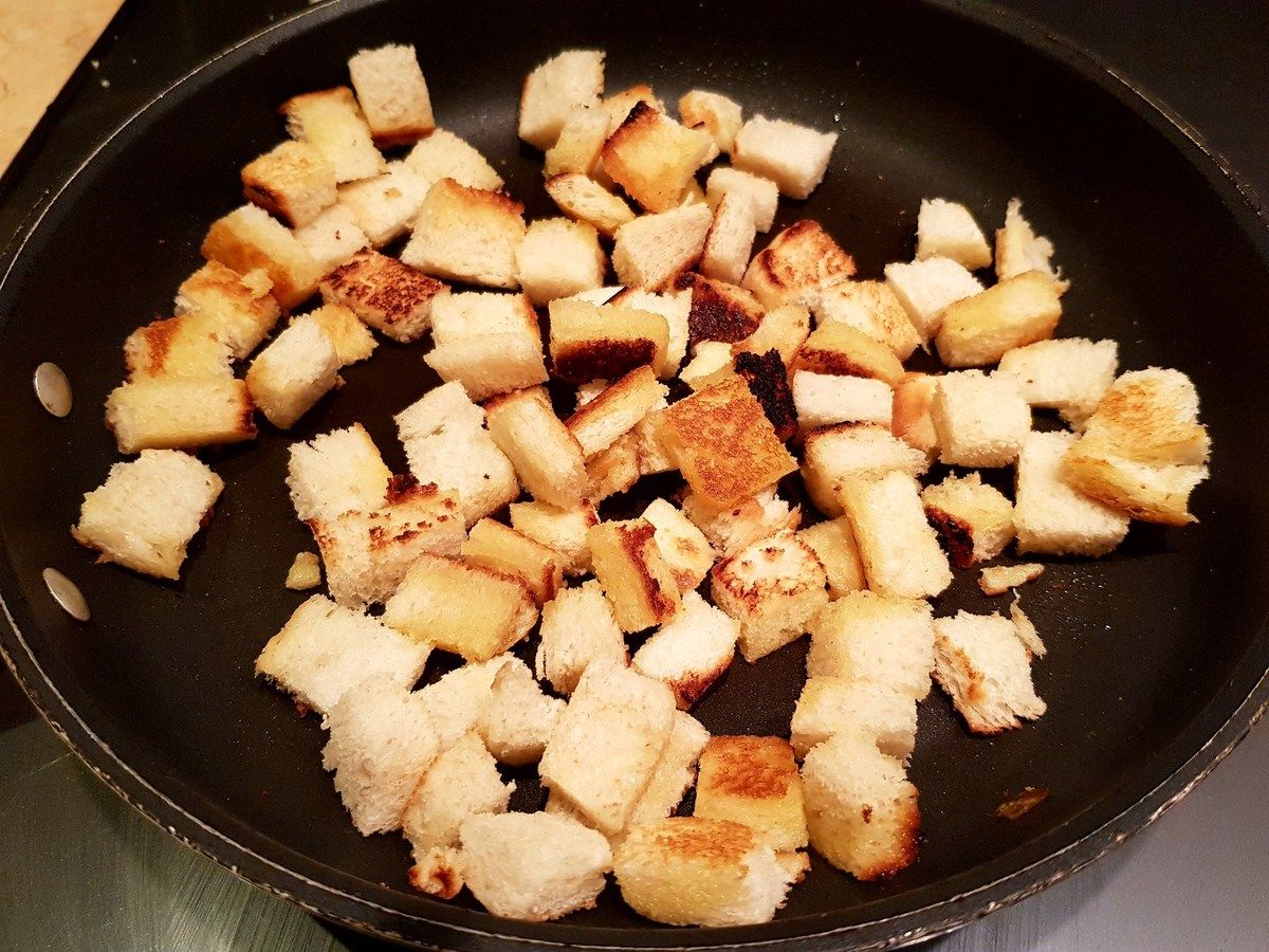 1) Enlever la croûte des toasts puis les couper en morceaux. Dans une poêle, les faire revenir quelques minutes dans 20g de beurre en mélangeant souvent jusqu'à ce qu'ils soient dorés. Sortir du feu et laisser refroidir.