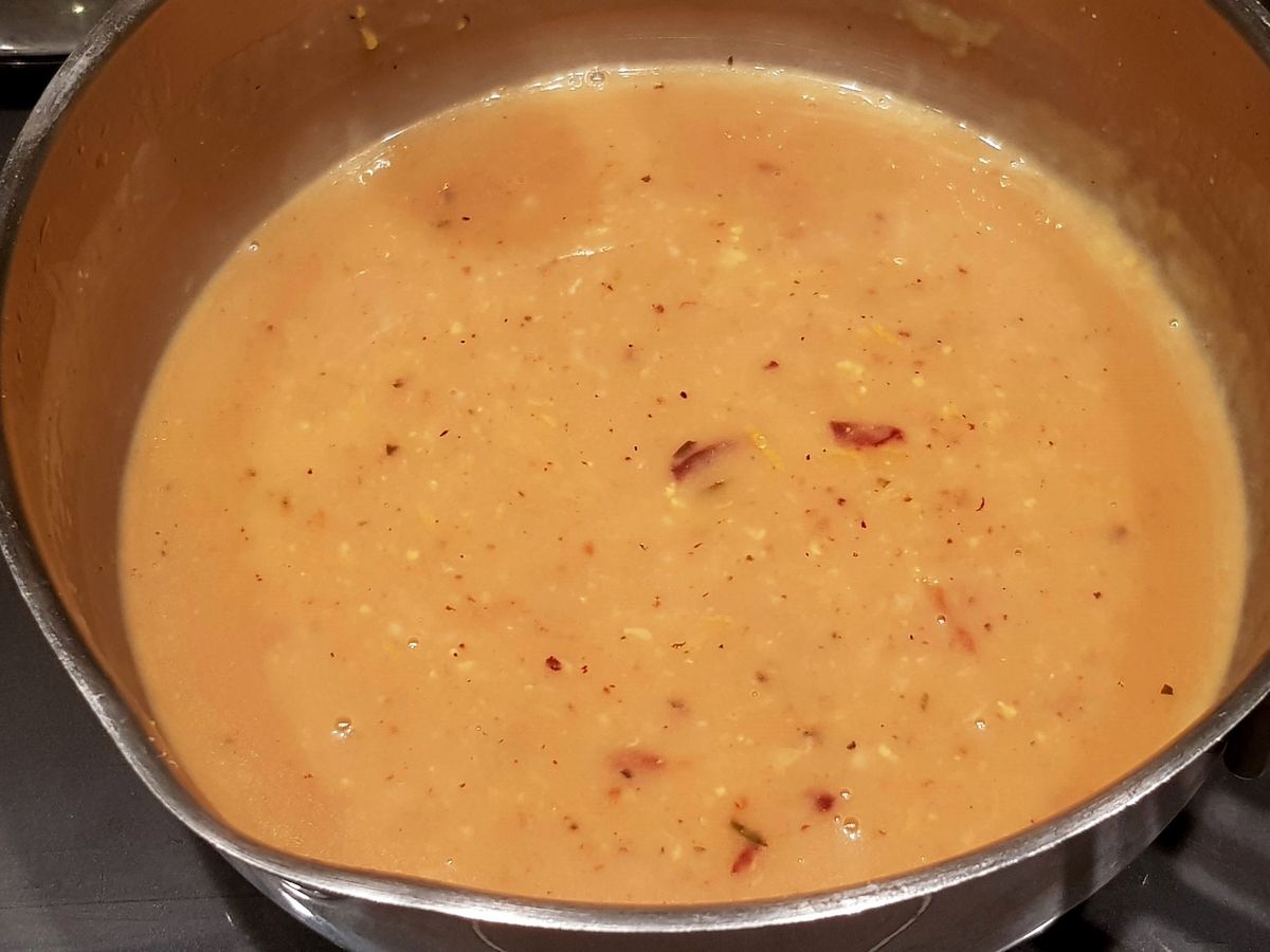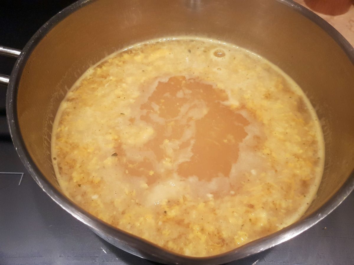 4) Pendant ce temps, préparer la sauce: Râper le zeste de la deuxième orange et en extraire le jus. Délayer la fécule dans le lait de coco. Peler le gingembre et le râper finement. Remettre à chauffer le bouillon restant du point 2. Y ajouter le vinaigre, le lait de coco avec la fécule, le zeste d'orange, le jus de l'orange, le gingembre, le sucre brun. Saler et poivrer. Porter à frémissements et mélanger jusqu'à épaississement de la sauce. Arroser les poulets à mi-cuisson avec deux petites louches de cette sauce.
