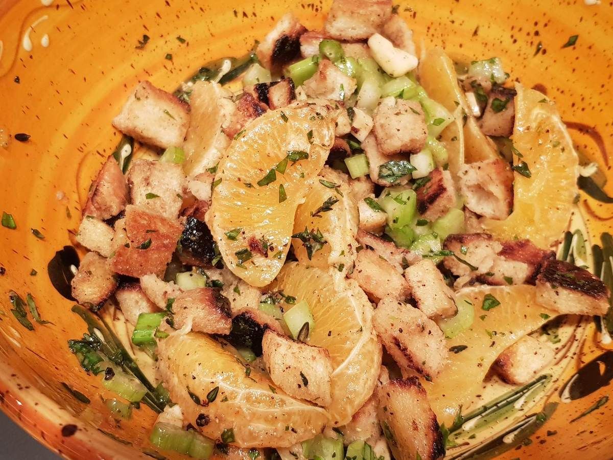 J'ai adoré ce poulet rôti avec une sauce à l'orange et au gingembre et farci d'un mélange de pain de mie, herbes, quartiers d'orange, ail, céleri branche et cumin. Franchement c'était original, équilibré au niveau des goûts et subtil. A refaire sans hésitation!
