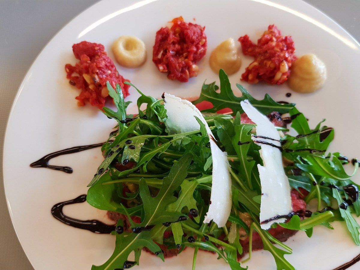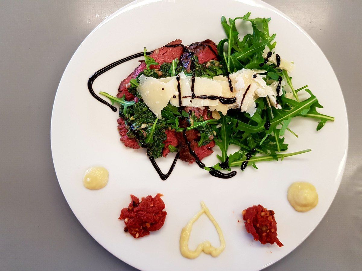 Imaginez... un filet de boeuf cuit en basse température, tendre à souhait, nappé d'une salsa verde à l'italienne aux herbes fraîches, câpres, ail, anchois et huile d'olive, une petite poignée de rucola qui apporte du peps, quelques copeaux d'un bon parmesan, des quenelles de tomates confites et pignons, un soupçon de purée d'artichauts parfumée à la truffe, le tout agrémenté d'un filet de vinaigre balsamique sirupeux.