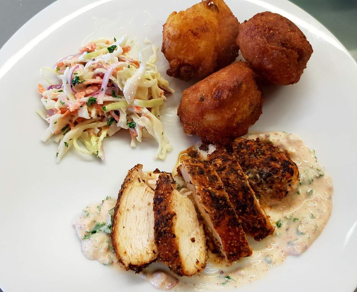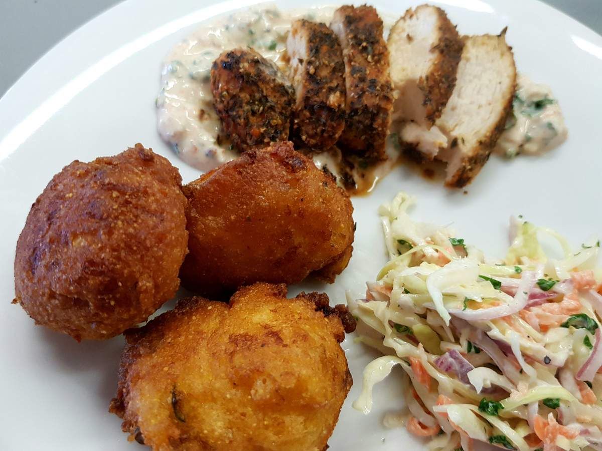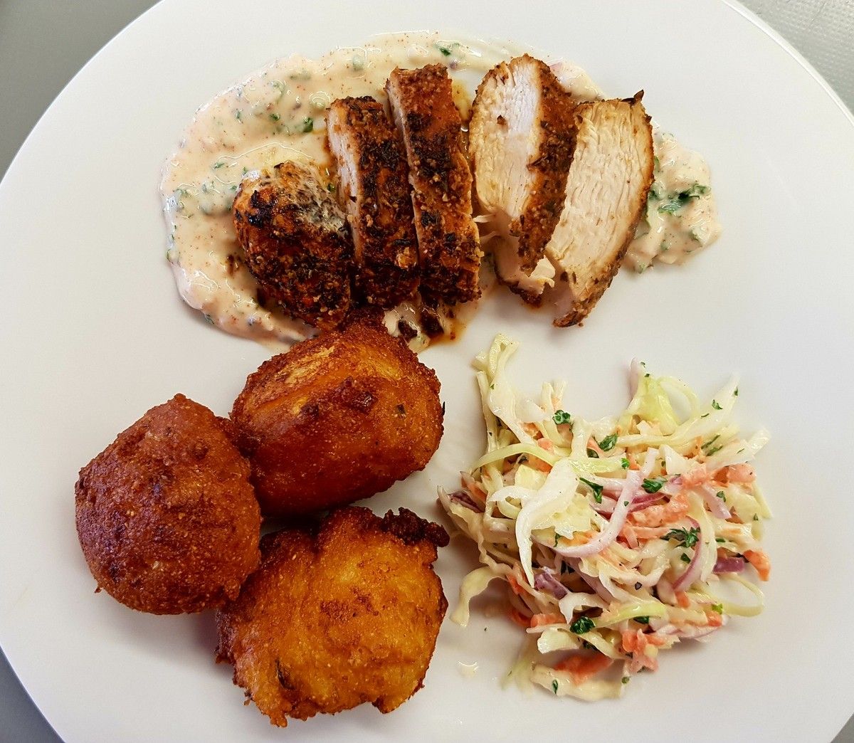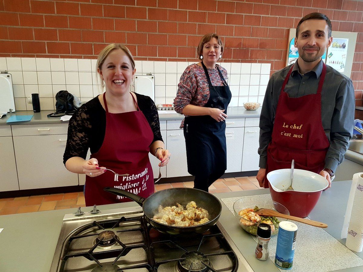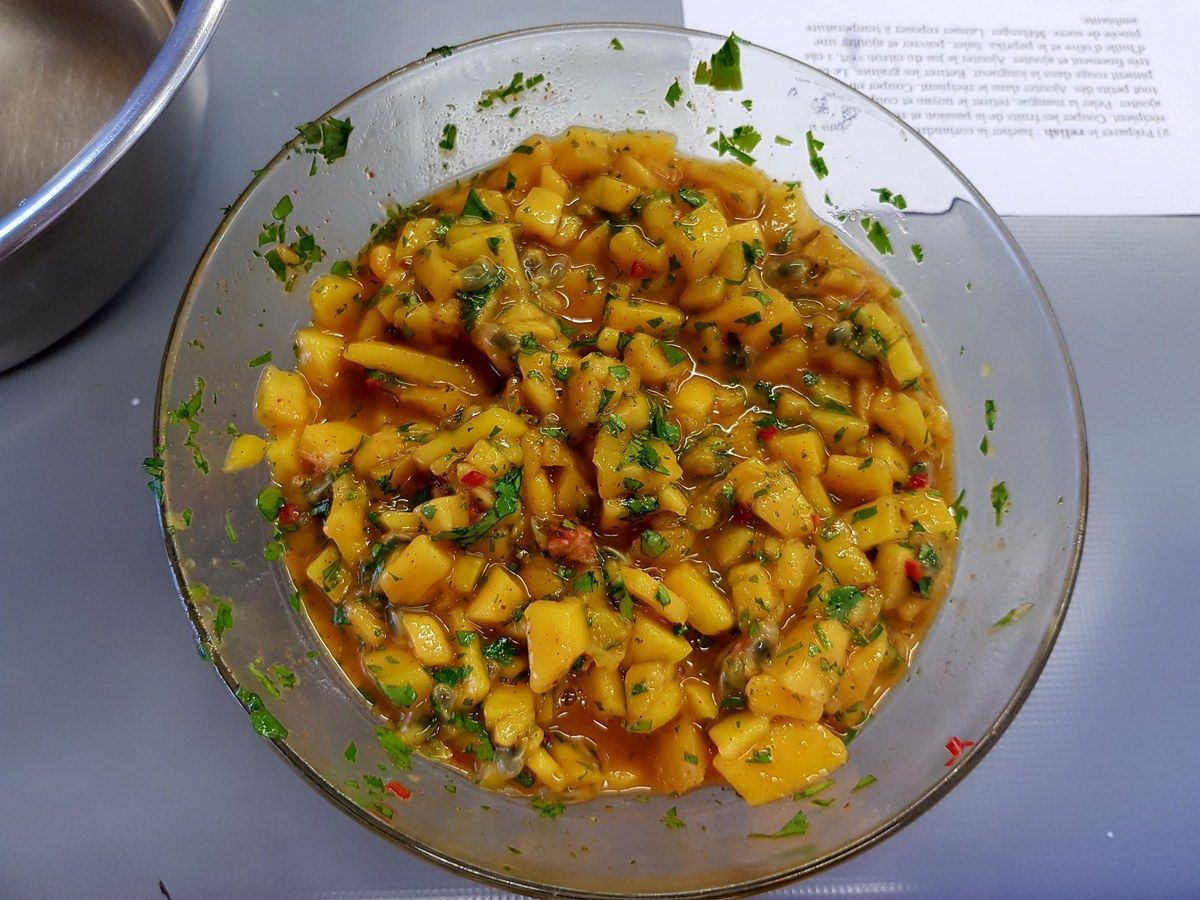 Et hop! Voici les photos du cours de cuisine d'aujourd'hui sur un nouveau thème: la cuisine de la Louisiane. Mes participants ont super bien bossé et dans la bonne humeur. De belles rencontres et le plaisir de revoir certains. Au menu, une soupe de tortue en entrée (z'en faites pas, c'était du veau), des crevettes créoles et un relish à la mangue et fruit de la passion, en plat principal du poulet noirci aux épices Cajun, sauce au raifort, Hush Puppies (beignets à la polenta et au maïs) et salade Coleslaw. Et en dessert une belle tarte au citron vert meringuée. Magnifique, je suis trop contente, du résultat et de ce moment partagé avec eux. Et ravie de leur avoir offert de jolies découvertes culinaires!