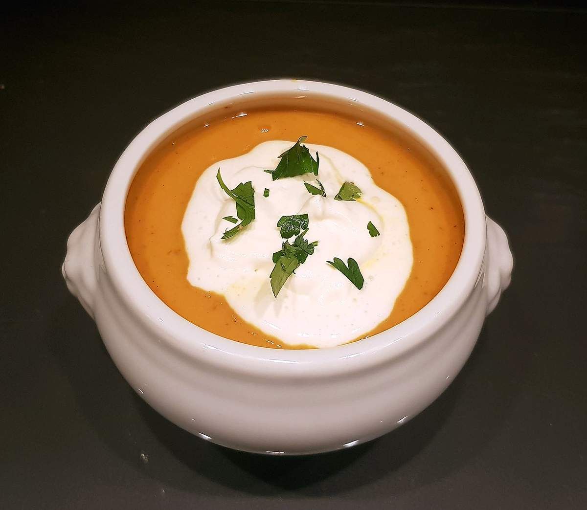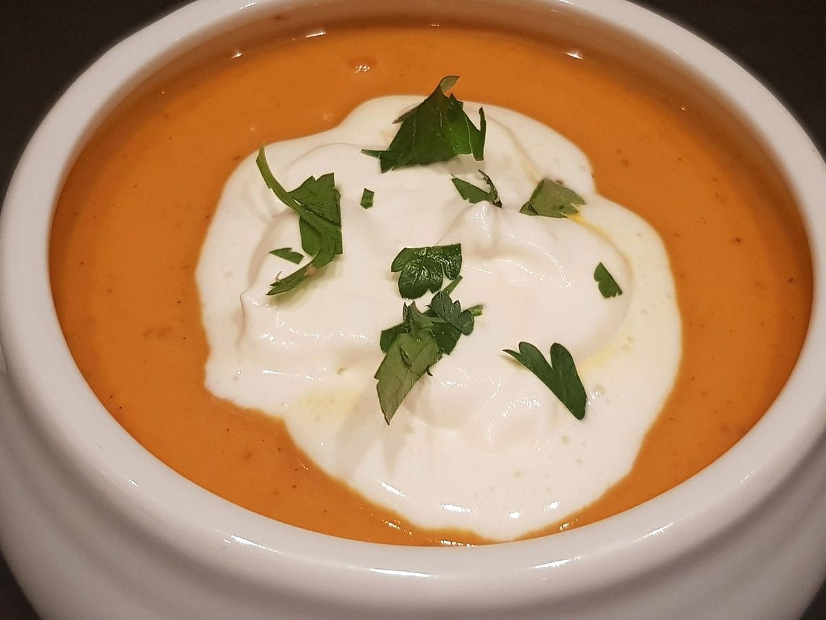 5) Servir dans des assiettes creuses ou des bols. Déposer un nuage de crème fouettée sur le velouté, un peu de persil plat et servir de suite (la crème tombe très vite!)