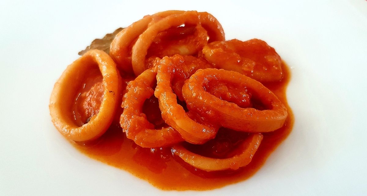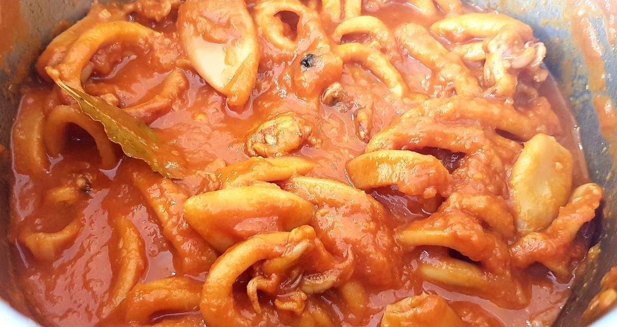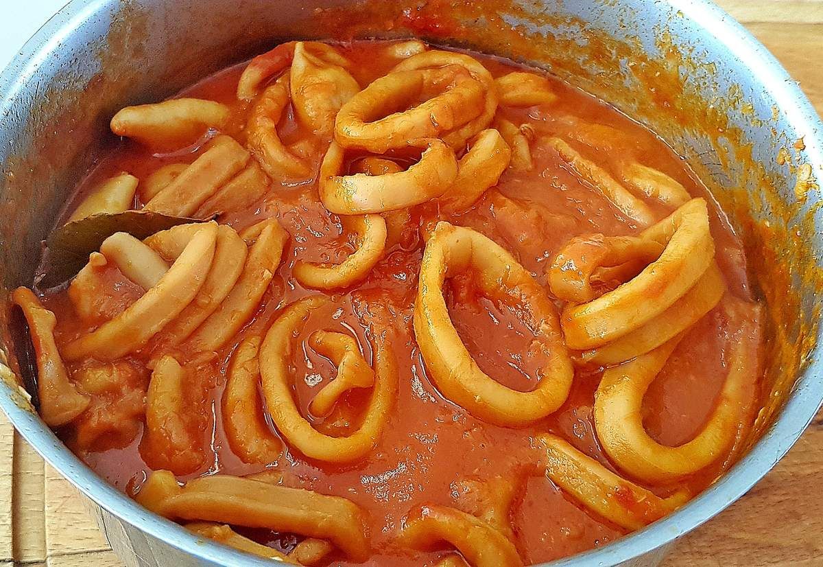 Une longue cuisson dans du vin, avec de l'oignon, de l'ail, du concentré de tomates, du laurier, des grains de poivre, permet d'avoir des calamars tendres à souhait, donc pas du tout caoutchouteux. La sauce, quant à elle, est divinement subtile et parfumée. On ferme les yeux et on est au bord de la mer...