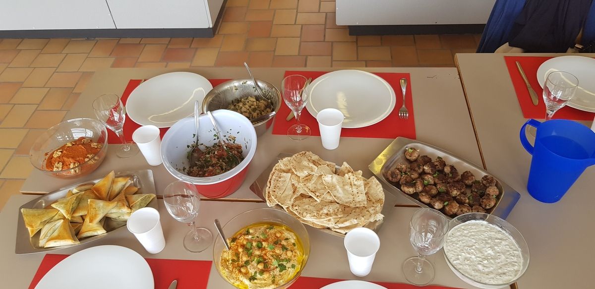 Un super cours sur les mezze libanais. Une équipe très chouette comme d'hab. Au menu des boulettes kefta, une sauce yaourt, concombre et menthe, un purée de poivrons aux noix, des samossas au fromage de chèvre, épinards et pignons,une salade de haricots blancs, de l'hommos et un taboulé libanais. MIAM!