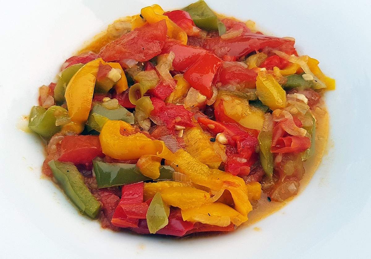 Cette piperade réalisée avec des poivrons rouges, verts et jaunes, des tomates, de l'oignon, de l'ail, bien compotée, fait penser à sa copine la ratatouille (ma recette ICI). L'huile d'olive est à l'honneur c'est certain. A ce sujet, ne soyez pas radins avec l'huile d'olive dans cette recette, c'est ce qui fait tout son charme, entre autres.