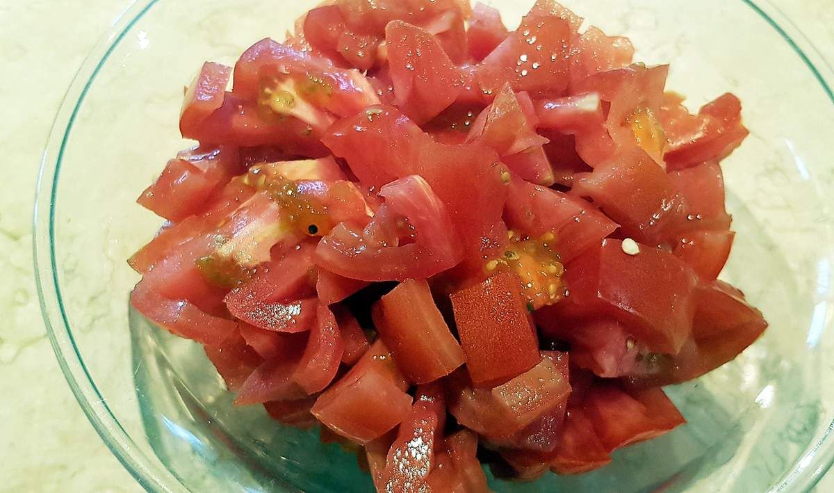 1) Eplucher les oignons, les couper en deux puis en lamelles. Peler les gousses d'ail et les hacher. Rincer les poivrons sous l'eau froide, les sécher puis les couper en deux. Retirer le centre avec les pépins et le pédoncule. Les couper en lanières. Rincer les tomates sous l'eau froide, les sécher puis les couper en deux, retirer le pédoncule et les couper en morceaux.