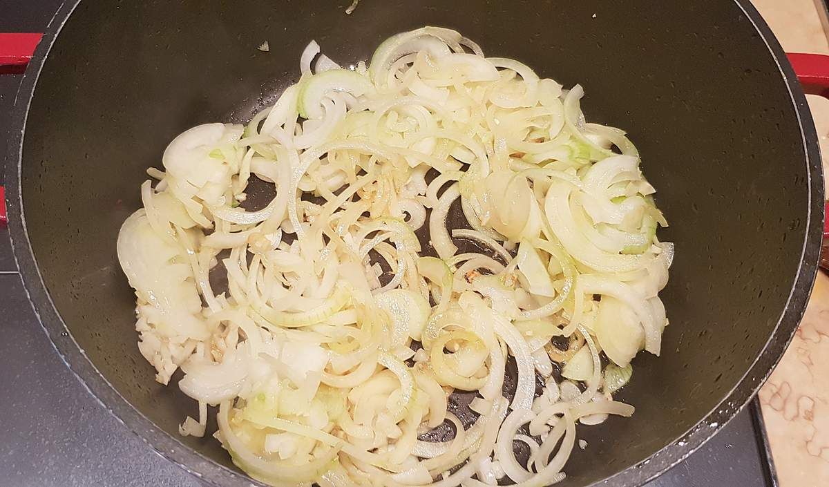 2) Dans une cocotte, mettre à chauffer un bon filet d'huile d'olive (recouvrir le fond de la cocotte avec l'huile d'olive) et saisir sur feu moyen les poivrons 5 minutes en mélangeant. Les mettre dans un récipient. Dans la même cocotte, remettre un peu d'huile d'olive et ajouter les oignons et l'ail. Faire suer quelques minutes en mélangeant.