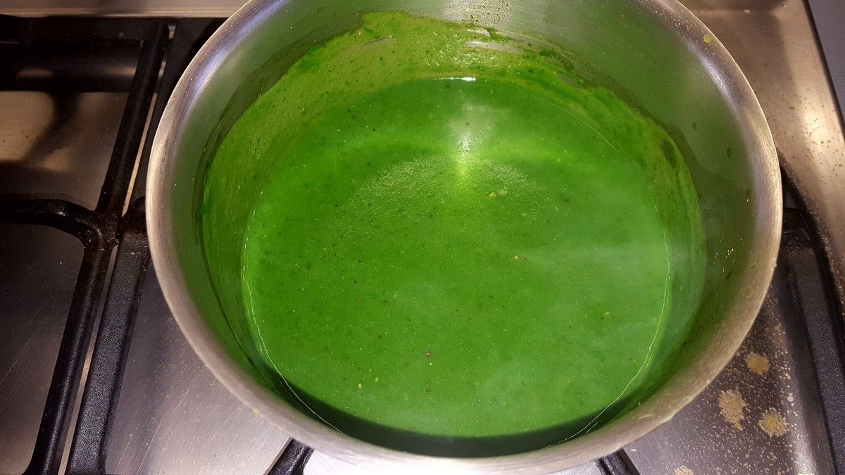 1) Porter à ébullition 1 litre d’eau dans une casserole avec les cubes de bouillon de volaille. Passer les herbes sous l’eau froide. Mettre de côté un peu de cresson pour la déco. Lorsque l’eau bout, plonger le cresson et le persil plat pendant 2 minutes. Egoutter et conserver le jus de cuisson.