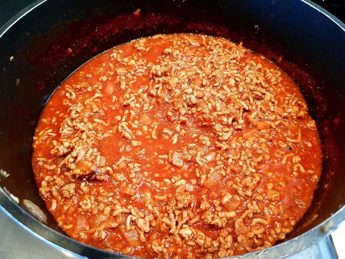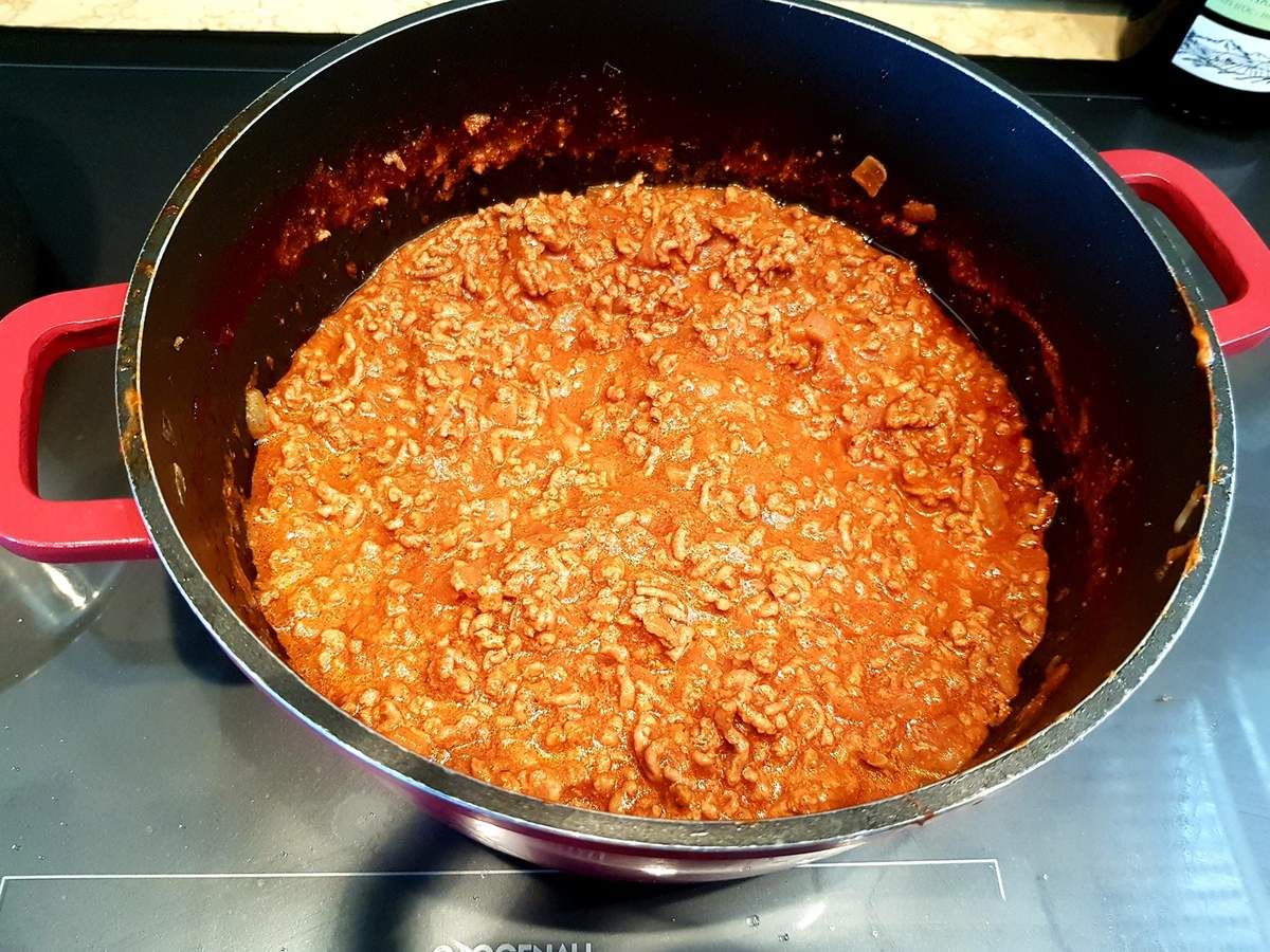 2) Ajouter le vin blanc et laisser réduire 2 à 3 minutes. Ajouter la 1/2 càc de cannelle, la pincée de sucre, la feuille de laurier et le coulis de tomate. Saler et poivrer. A feu doux, laisser la sauce mijoter 30 à 45 minutes pour qu'elle réduise bien. Goûter et rectifier l'assaisonnement. Sortir la cocotte du feu.