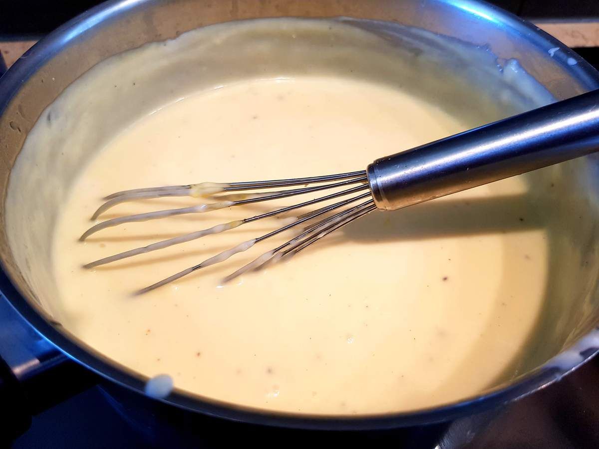 5) Préparer la béchamel: faire fondre les 100g de beurre dans une casserole. Ajouter la farine et mélanger avec un fouet jusqu'à ce que cela forme une pâte homogène. Retirer la casserole du feu et ajouter le lait d'un coup. Fouetter vivement et remettre la casserole sur le feu. Amener à ébullition sans cesser de fouetter puis cuire à feu doux quelques minutes jusqu'à ce que la béchamel épaississe. Saler, poivrer et ajouter de la noix de muscade en poudre. Goûter et rectifier l'assaisonnement. Lorsque la béchamel a pris, ajouter les 100g de Cheddar restants et bien mélanger. Sortir la casserole du feu, laisser tiédir un peu puis ajouter les 3 jaunes d'oeufs. Bien mélanger.