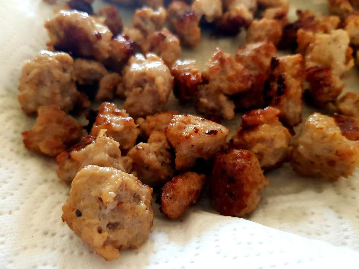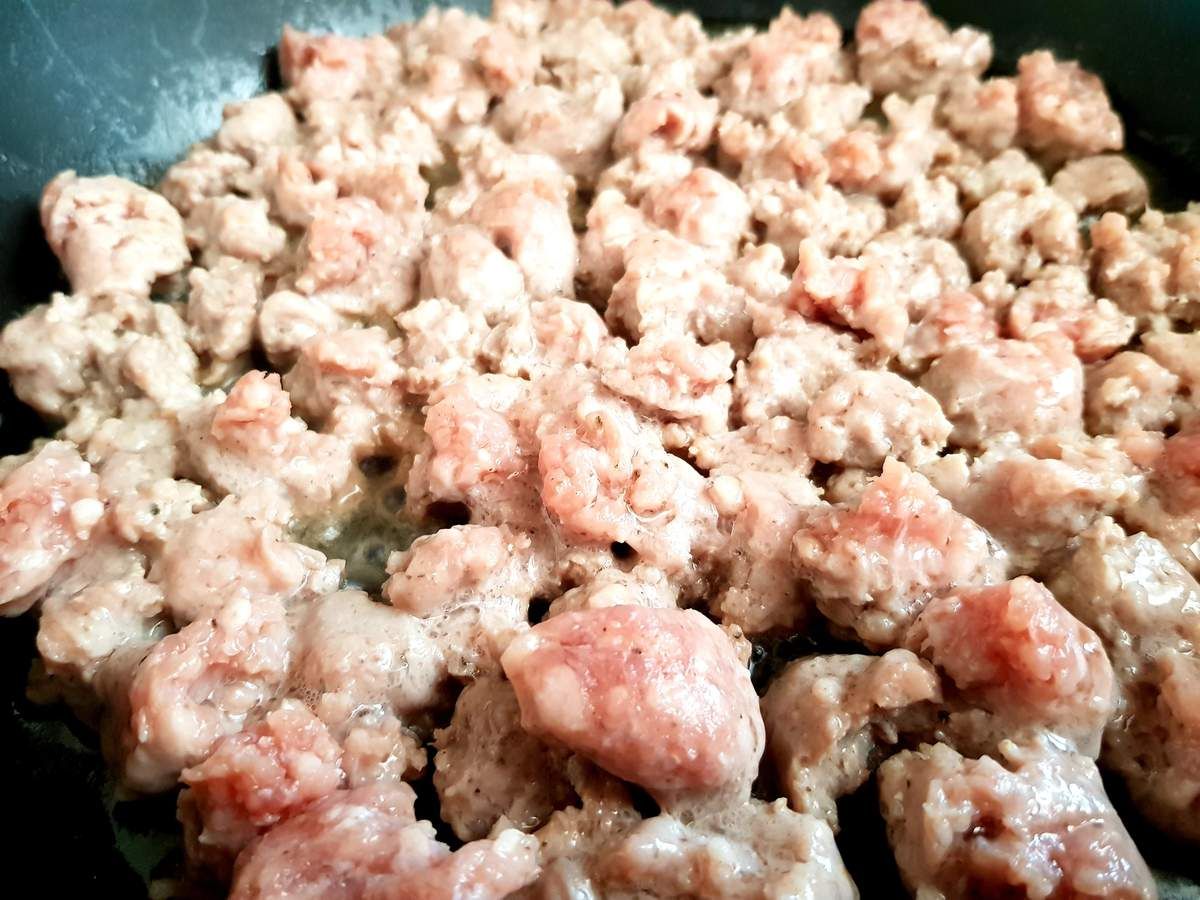 1) Retirer la peau de la saucisse. Former des petits tas avec la chair et mettre sur un plat. Dans une poêle chaude, sans matière grasse, mettre les petits tas de saucisse sans qu'ils ne se superposent. Laisser cuire sans mélanger sur feu moyen 5 minutes. La saucisse va cuire dans sa propre graisse. Lorsque le dessous des petits tas est doré, remuer avec une spatule et cuire encore quelques minutes en mélangeant. Sortir de la poêle et déposer la saucisse sur un plat recouvert de papier ménage. Réserver.