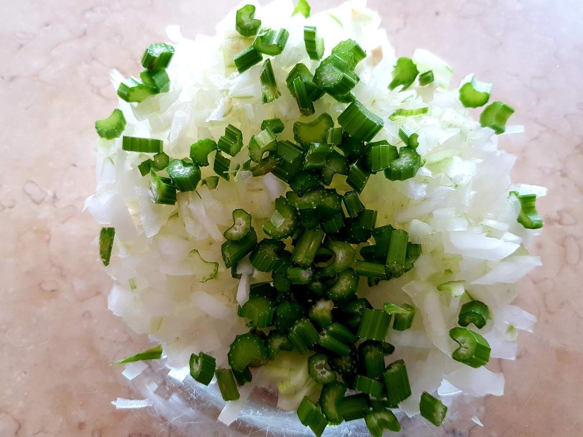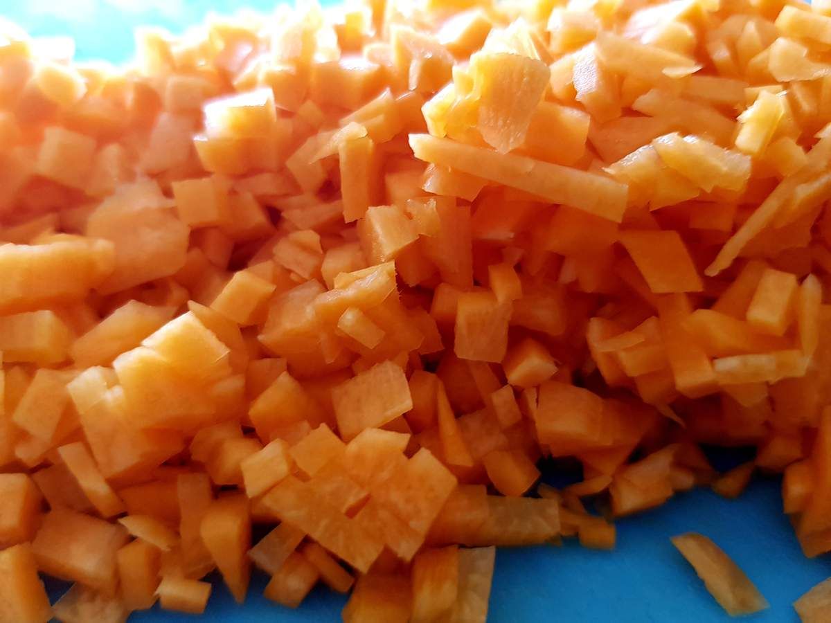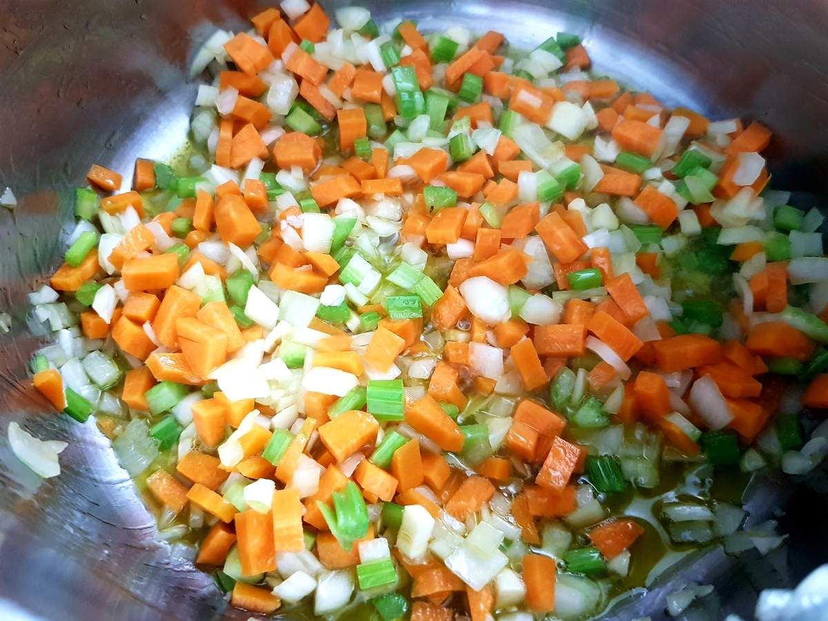 2) Couper en petits dés l'oignon, l'ail, la carotte et la branche de céleri. Verser de l'huile d'olive dans une cocotte de façon à en recouvrir le fond (ne soyez pas radins avec l'huile d'olive, elle contribue à la réussite de cette recette ;-)). Faire chauffer et ajouter les légumes. Les faire revenir en mélangeant sur feu moyen-fort 3 à 4 minutes.