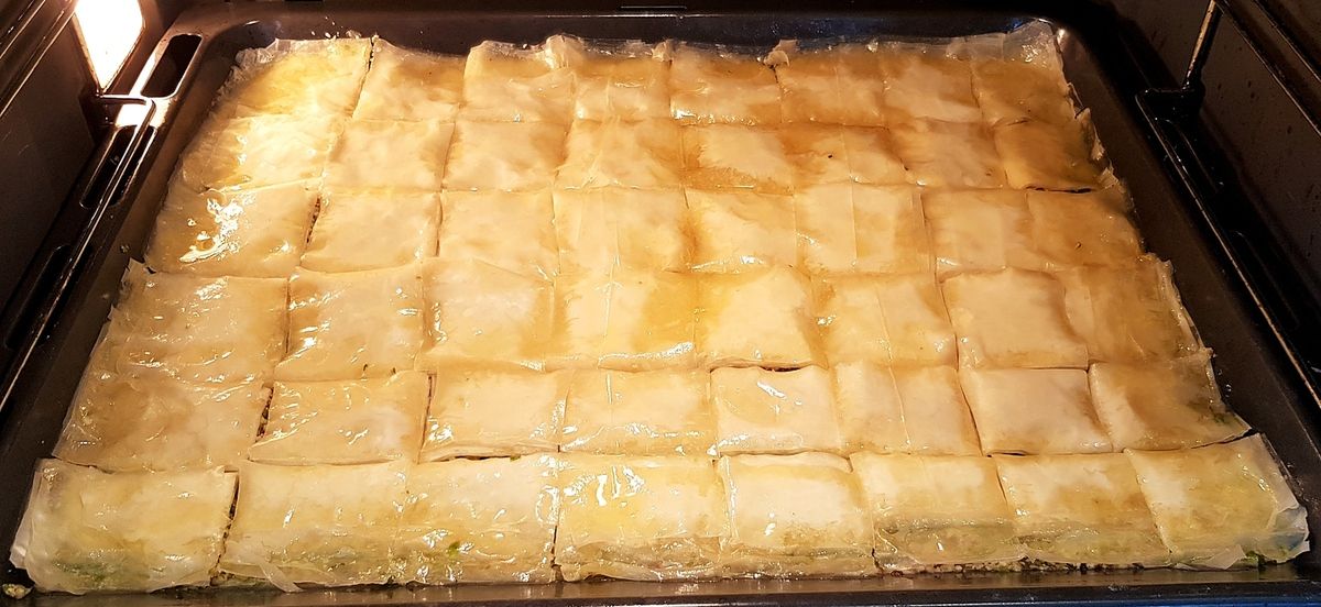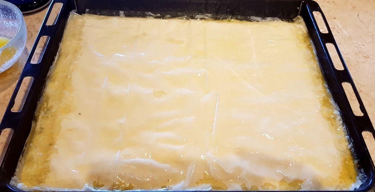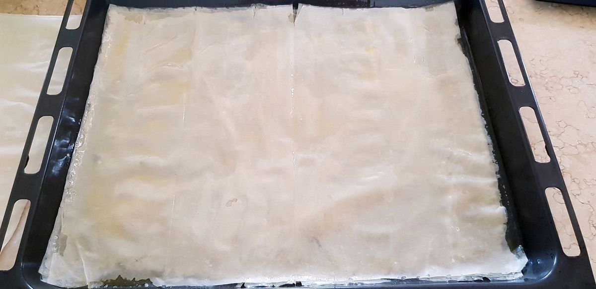 4) A l'aide d'un pinceau à pâtisserie, beurrer la plaque propre du four (style lèche-frite) avec le beurre fondu au point 1. Déposer une feuille de pâte Filo. Puis une autre. Beurrer cette deuxième pâte avec le pinceau. Procéder ainsi en utilisant 20 feuilles (à chevaucher si besoin de couche en couche) et en les beurrant une fois sur deux. Donc une feuille de pâte, une deuxième beurrée (y compris les bords), une couche de pâte, une deuxième beurrée et ainsi de suite... Bien appuyer entre chaque couche.