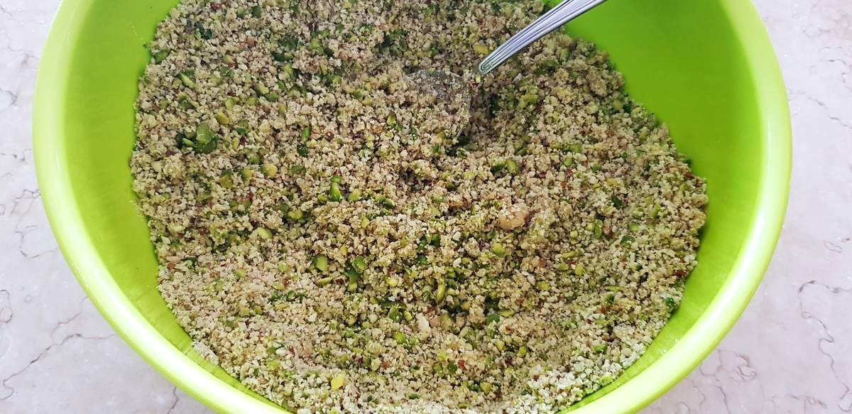 3) Préchauffer le four à 180°C. Mixer les cerneaux de noix, les pistaches et les noisettes dans un mixeur. Finement mais pas trop. Les mélanger dans un saladier avec la poudre d'amandes. Y ajouter 2 càs de miel et 70g du beurre fondu au point 1. Mélanger.