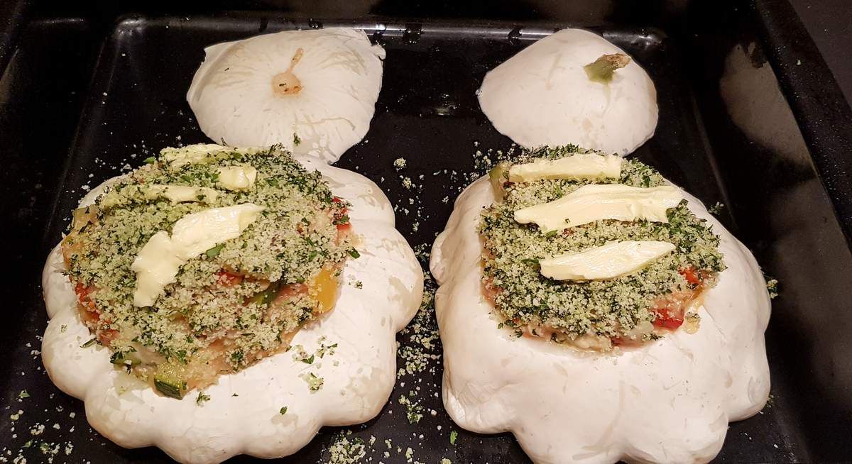 7) Dans un plat à gratin, mettre un filet d'huile d'olive sur le fond. Placer les pâtissons et les chapeaux à part. Les farcir généreusement du mélange de légumes. Ne pas hésiter à mettre de la farce (donc pas à ras du pâtisson). Saupoudrer généreusement de chapelure. Déposer quelques lamelles de beurre.