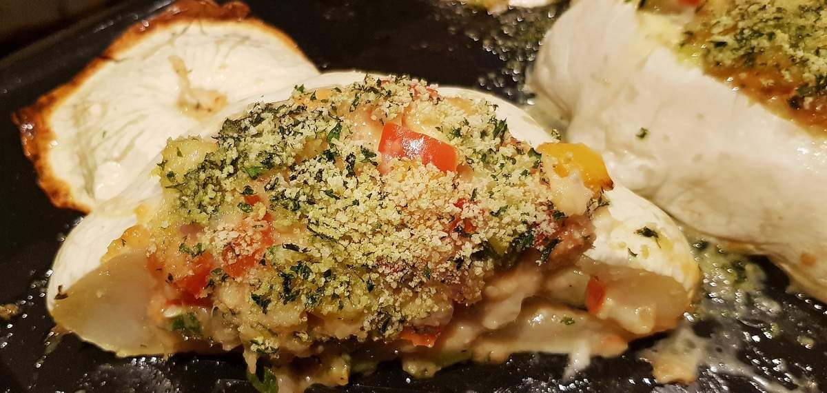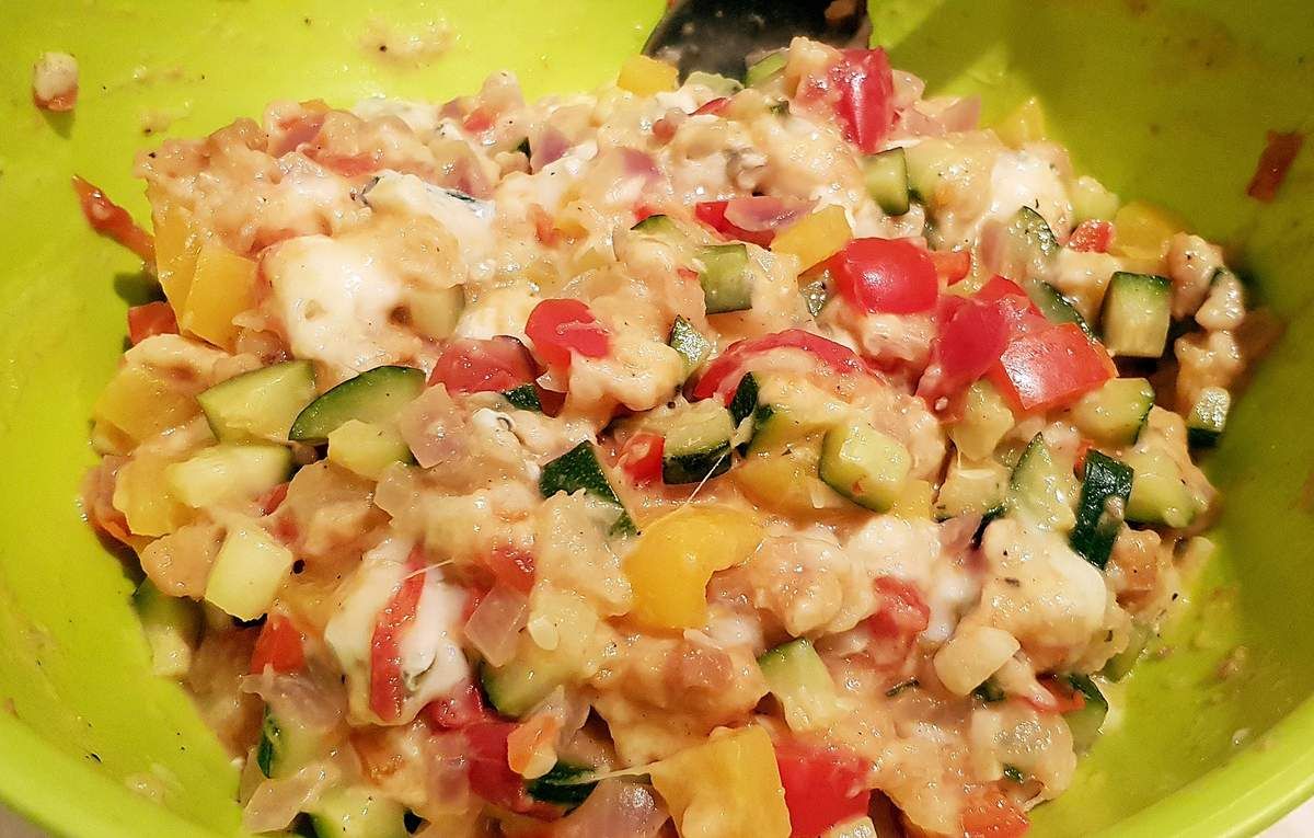 J'ai donc réalisé une farce à base de légumes coupés en petits morceaux, de pain de mie pour le moelleux et de ... roquefort. Et oui, et je peux vous dire que le roquefort amène vraiment de la personnalité à cette recette. Il est présent sans être envahissant. Bien sûr, il faut l'aimer. Si vous ne courez pas après sa force typique, vous pouvez utiliser son cousin le gorgonzola qui sera plus discret. Et si vraiment les bleus ne vous tentent pas, prenez un autre fromage qui fondra facilement (fromage de chèvre, mozzarella, ...).