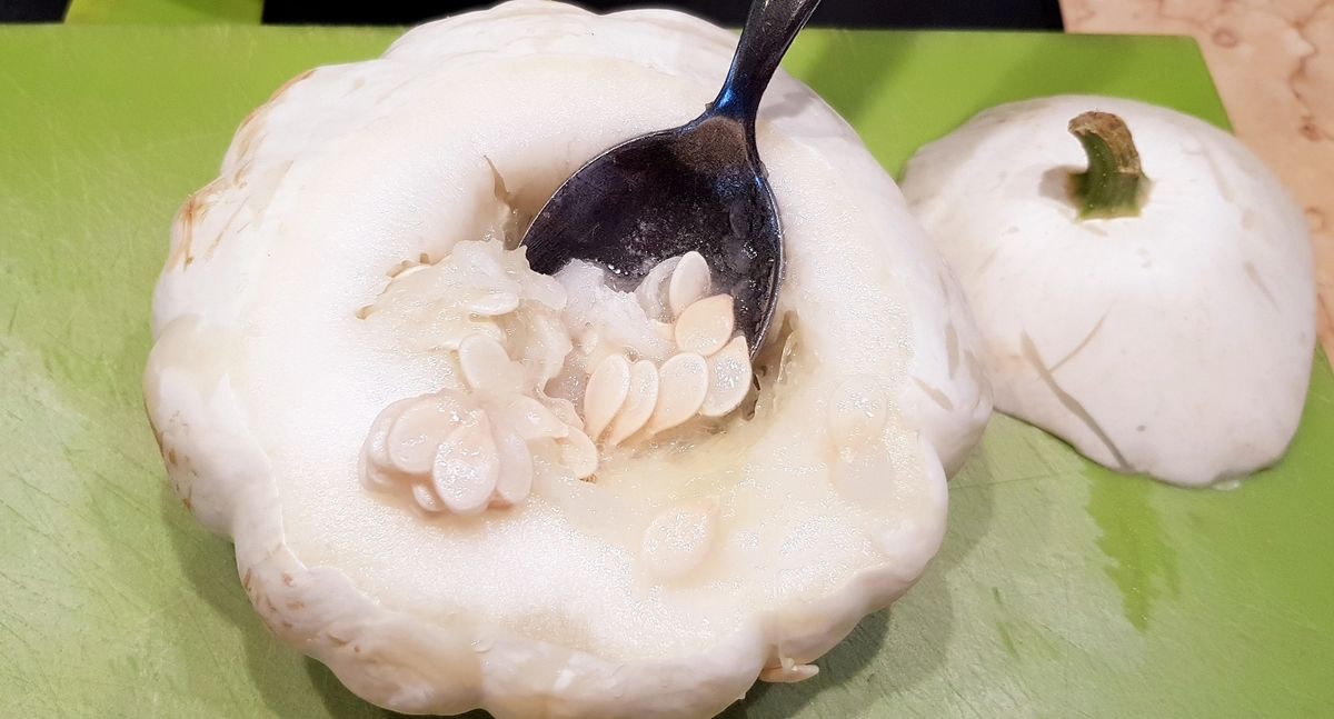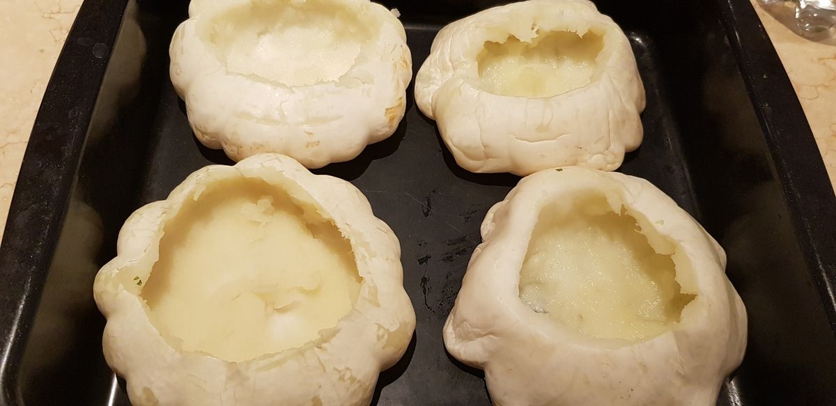 4) Lorsque les pâtissons sont tièdes, couper les chapeaux. Vider l'intérieur qui contient les graines et les filaments avec une cuillère et jeter. Creuser la chair restante avec une cuillère, la hacher un peu et réserver. Attention, il ne faut pas prélever toute la chair, en laisser pour que les pâtissons se tiennent à la cuisson dans le four. Attention à ne pas faire de trou dans le fond. Saler un peu l'intérieur des pâtissons.