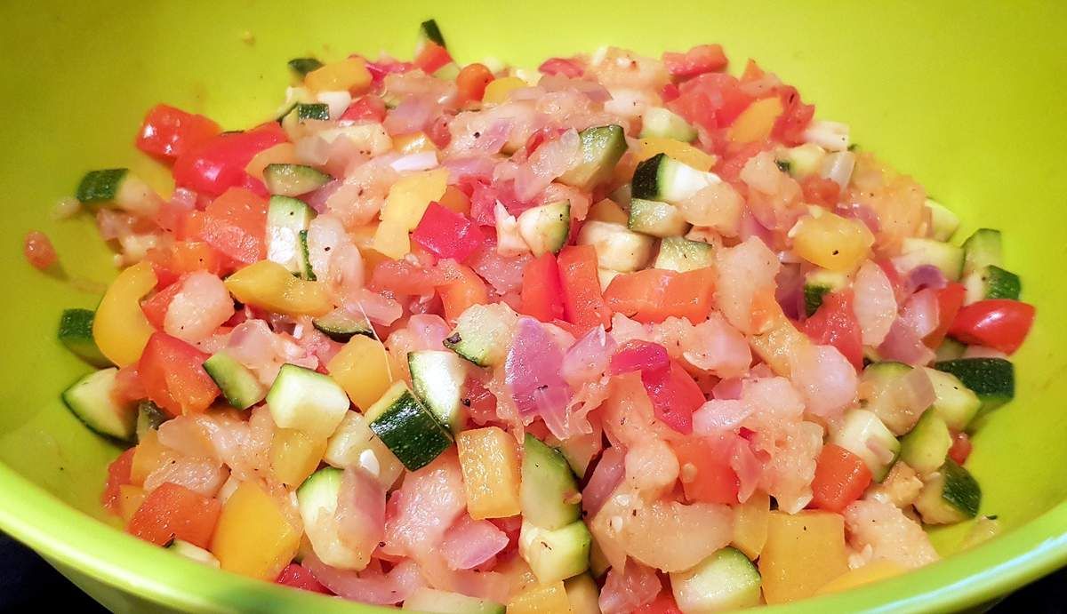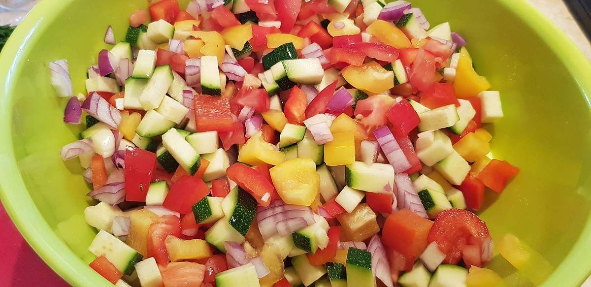 2) Pendant que les pâtissons cuisent, passer les légumes sous l'eau froide. Couper la courgette, la tomate et les poivrons en petits dés et mettre dans un récipient. Hacher les oignons et les 2 gousses d'ail et ajouter dans le récipient.
