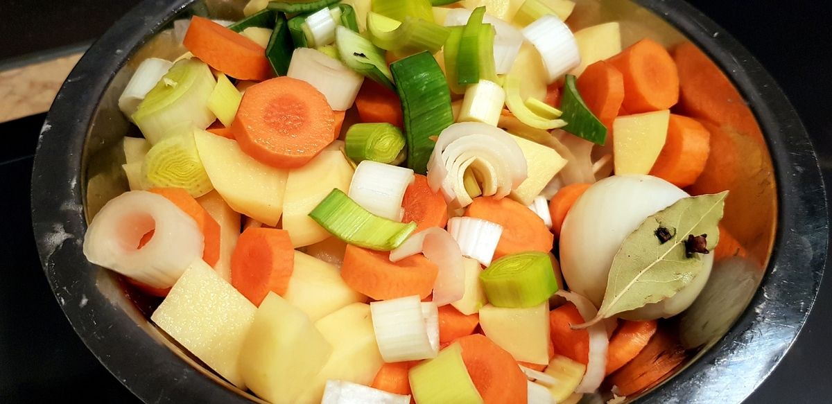 2) Couper le lard en dés (enlever le surplus de gras et les petits os) et réserver dans un bol. Peler les carottes et les couper en rondelles. Peler les gousses d'ail et les couper en lamelles. Peler l'oignon et le piquer avec les clous de girofle en passant à travers la feuille de laurier. Retirer la moitié du vert du poireau ou au moins l'extrémités des feuilles et couper le reste des feuilles avec le blanc en deux dans la longueur puis en petits tronçons. Laver le poireau sous l'eau froide pour éviter toute trace de terre. Peler les pommes de terre et les couper en cubes. Mettre tous les légumes ensemble dans un récipient.