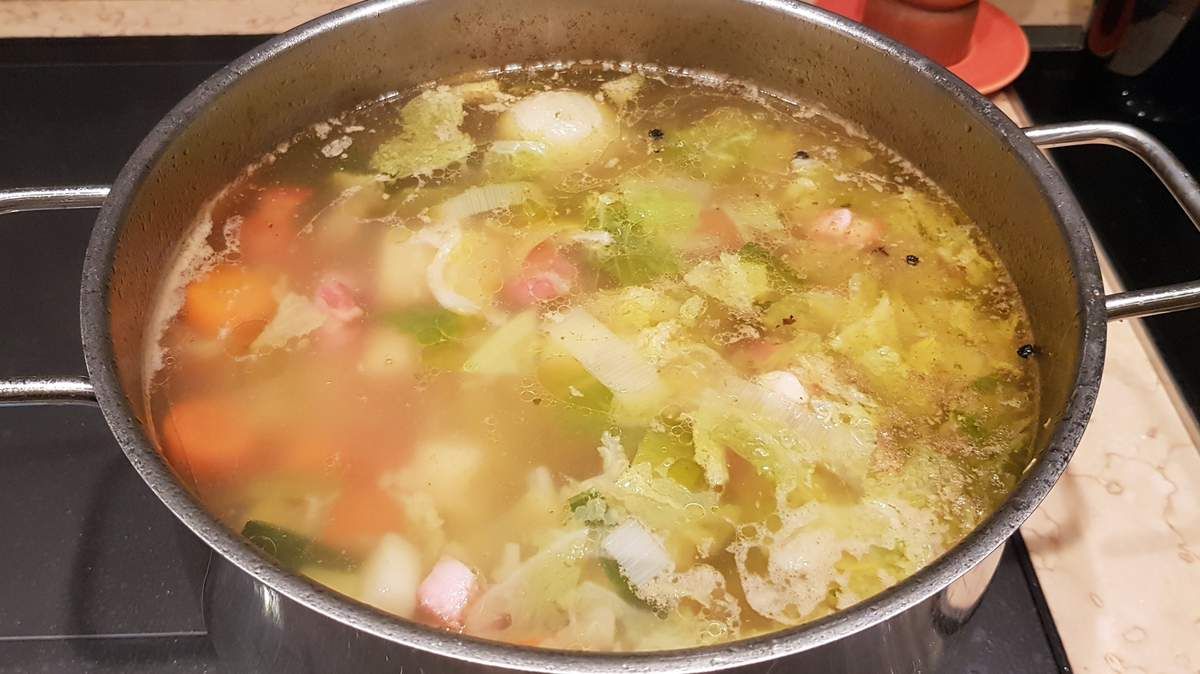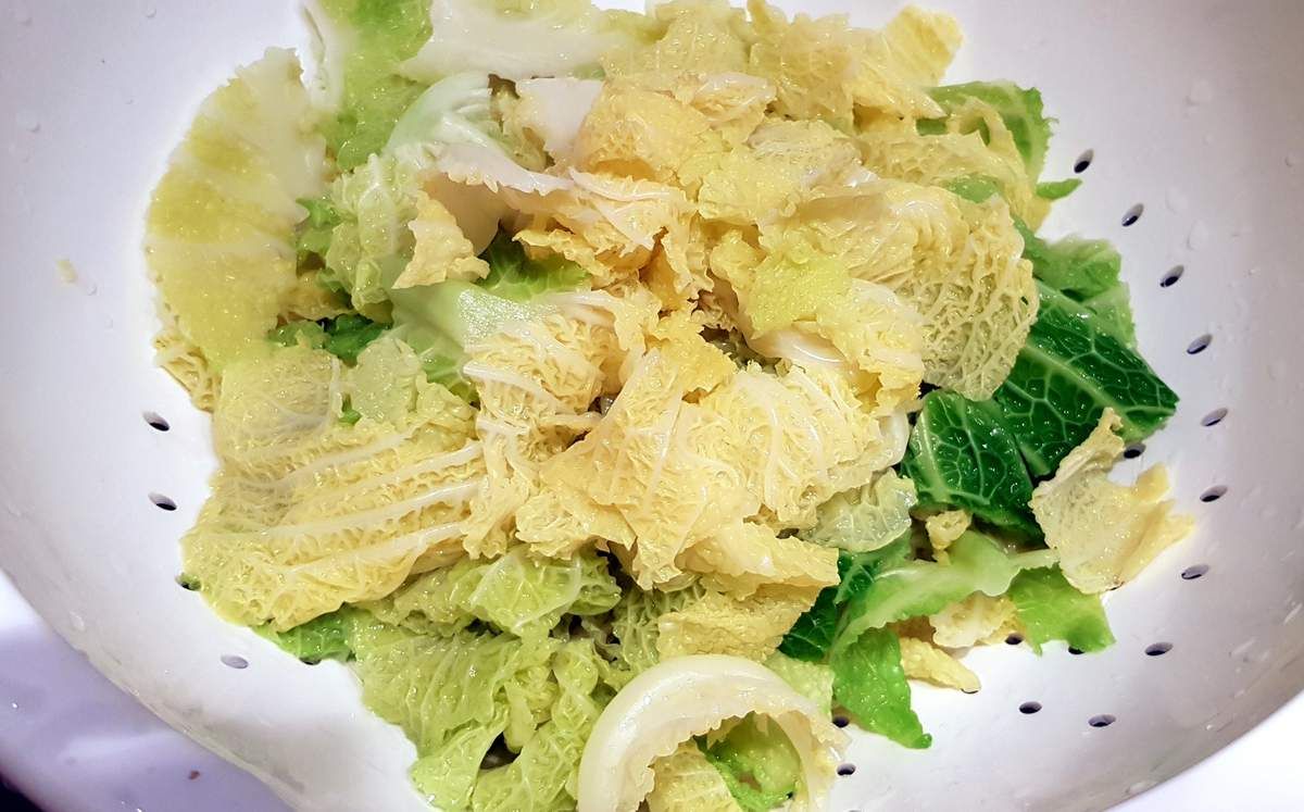 3) Dans une grande casserole, mettre un filet d'huile d'olive à chauffer et faire revenir les morceaux de lard en mélangeant quelques minutes. Ajouter ensuite tous les légumes, 3,5 litres d'eau environ (pour qu'ils soient tous bien couverts), les grains de poivre et 3 belles càc de sel. Porter à ébullition puis baisser à frémissements. Couper les feuilles de chou grossièrement et ajouter dans la casserole.
