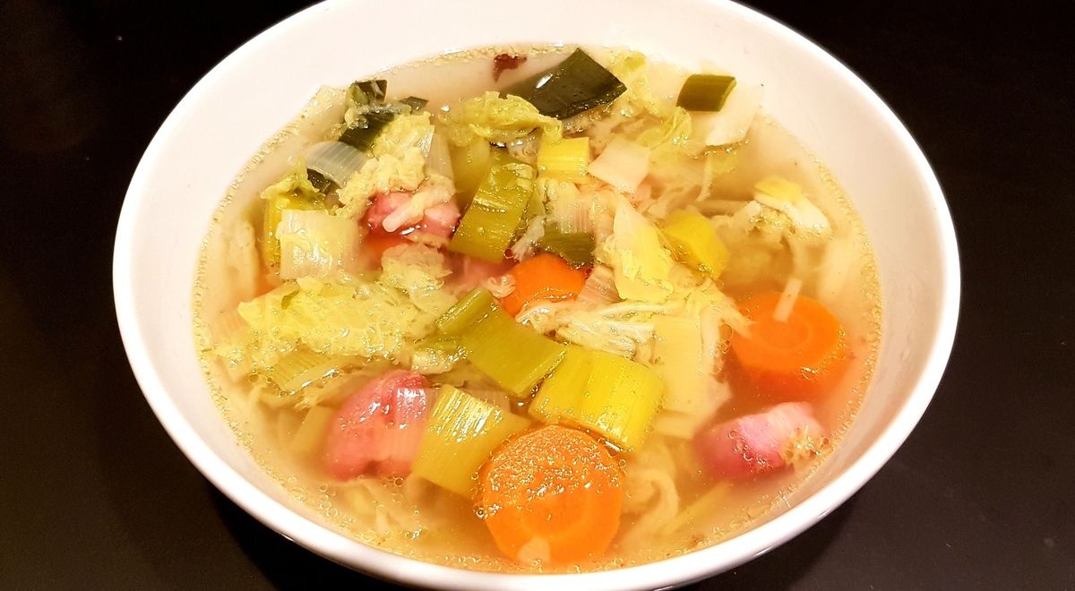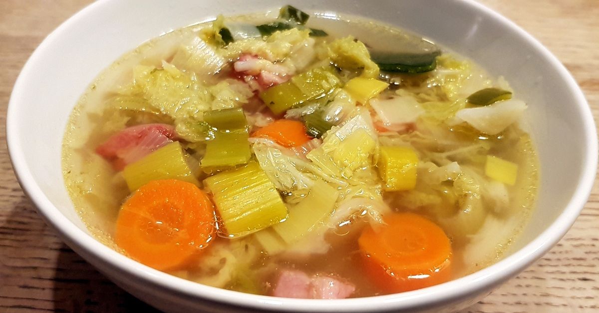 Donc, je dis: "Vive les choux! Et vive cette délicieuse et simple recette de soupe aux choux!" Parce qu'elle est BONNE. Et parce qu'elle a un bon petit goût légèrement fumé grâce au lard coupé en morceaux. Et surtout, un vrai goût de légumes. Comme à l'époque, vous savez quand nos aïeux n'avaient pas encore la CHANCE d'avoir des sachets de soupes déshydratées à dispo, pleins de conservateurs et d'exhausteurs de goûts très étranges. A l'époque, pour réaliser une soupe, ils n'avaient pas besoin de fouet pour délayer une poudre. Juste un couteau, une spatule, de bonnes odeurs, un peu de temps...