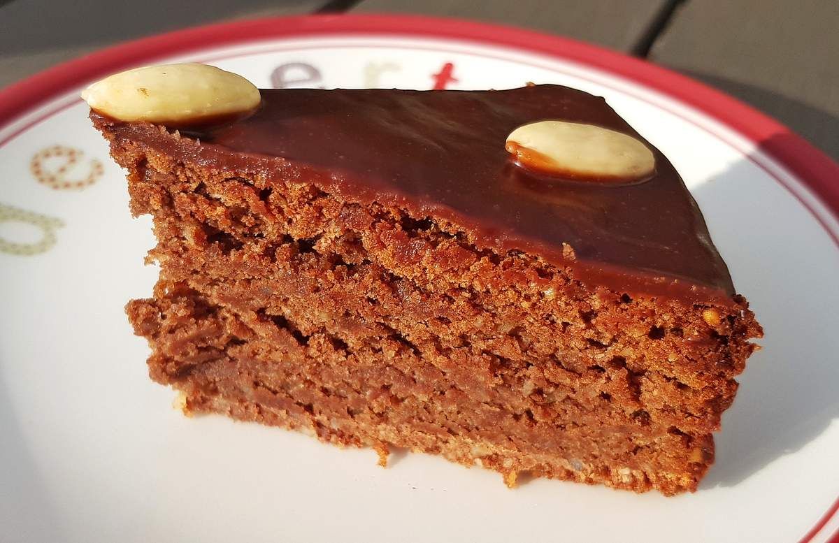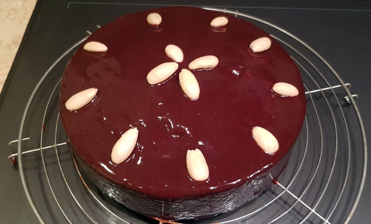 6) Déposer quelques amandes émondées entières pour la déco ou concasser quelques amandes et parsemer le dessus du gâteau. Lorsque le glaçage a refroidi, déposer le gâteau sur un plat de service et placer au réfrigérateur plusieurs heures, idéalement la veille. Déguster et conserver plusieurs jours au frais!