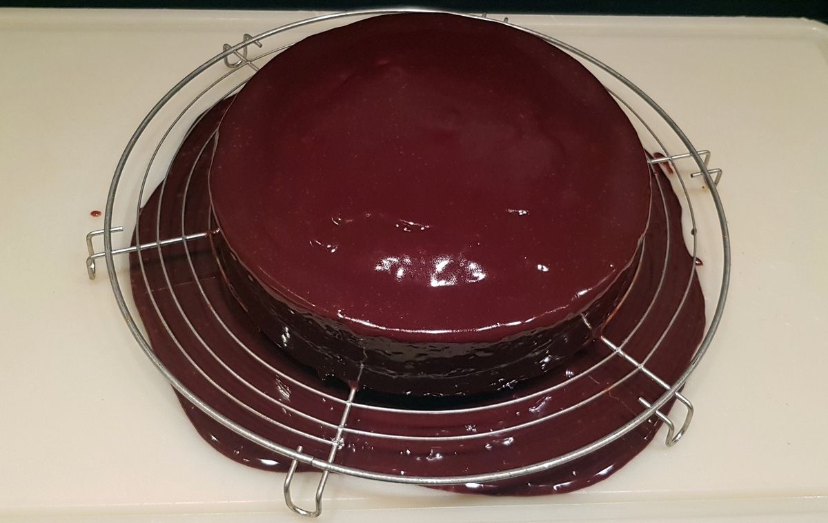 5) Pendant que le gâteau refroidit, préparer le glaçage: porter la crème et le sucre à ébullition dans une casserole. Baisser sur feu moyen et ajouter le chocolat en morceaux. Mélanger. Lorsque le chocolat est fondu, retirer la casserole du feu et incorporer le beurre en morceaux. Bien mélanger jusqu'à ce que le beurre soit fondu pour obtenir un glaçage homogène. Faire couler lentement le glaçage de toutes parts sur le gâteau (mettre une planche dessous).