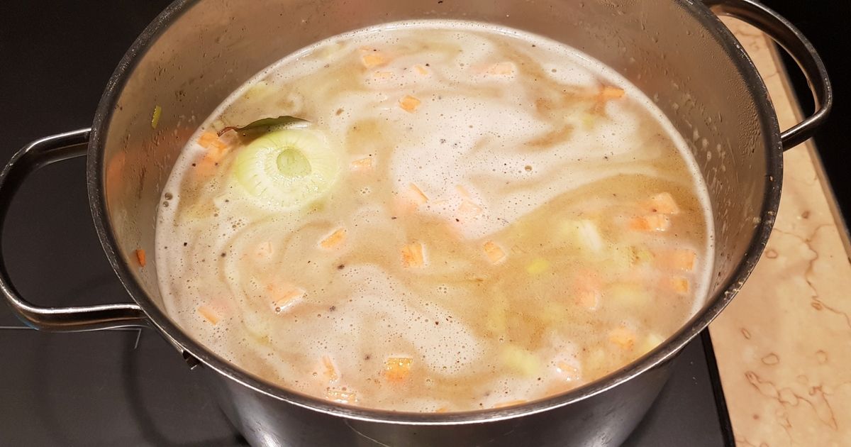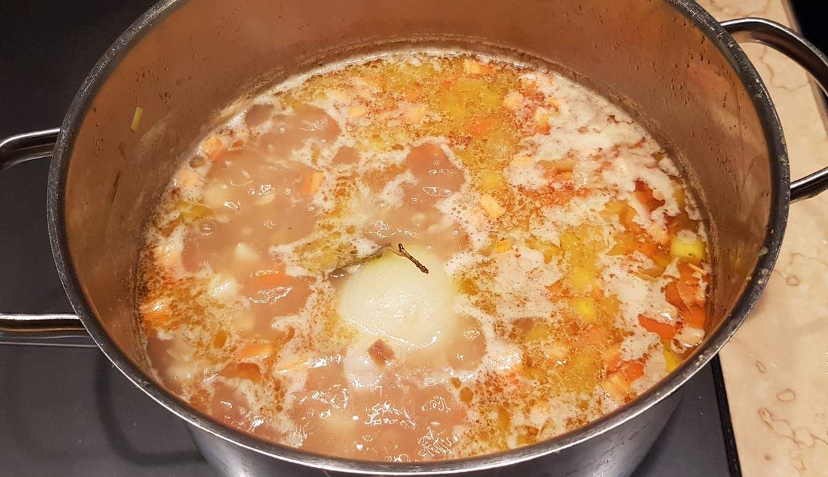 4) Ajouter dans la casserole 2,5 litres d'eau, l'orge et l'oignon piqué. Ajouter aussi les cubes de bouillon de légumes. Poivrer généreusement. Ne pas saler pour l'instant. Porter à ébullition puis baisser le feu. Laisser cuire 1h00 sur feu doux à découvert.