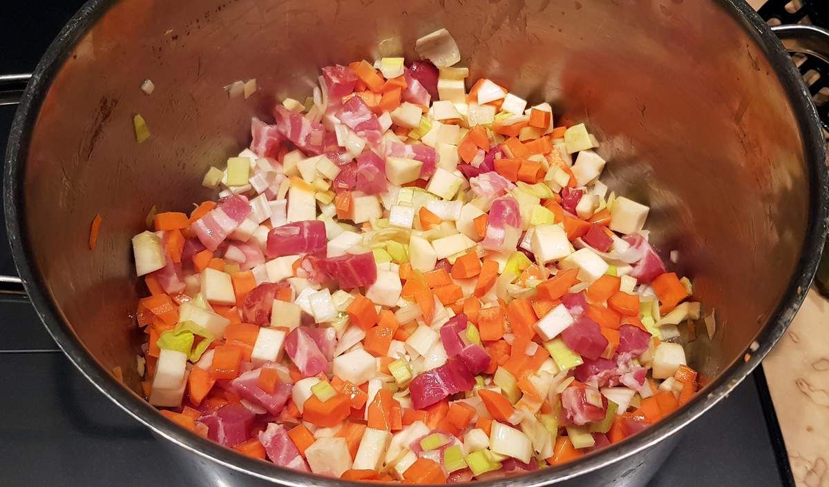 3) Dans une casserole, mettre à chauffer un peu de beurre à rôtir et faire revenir le poireau, les carottes, le céleri et le lard quelques minutes en mélangeant. Peler l'oignon et le piquer avec les clous de girofle à travers les feuilles de laurier.
