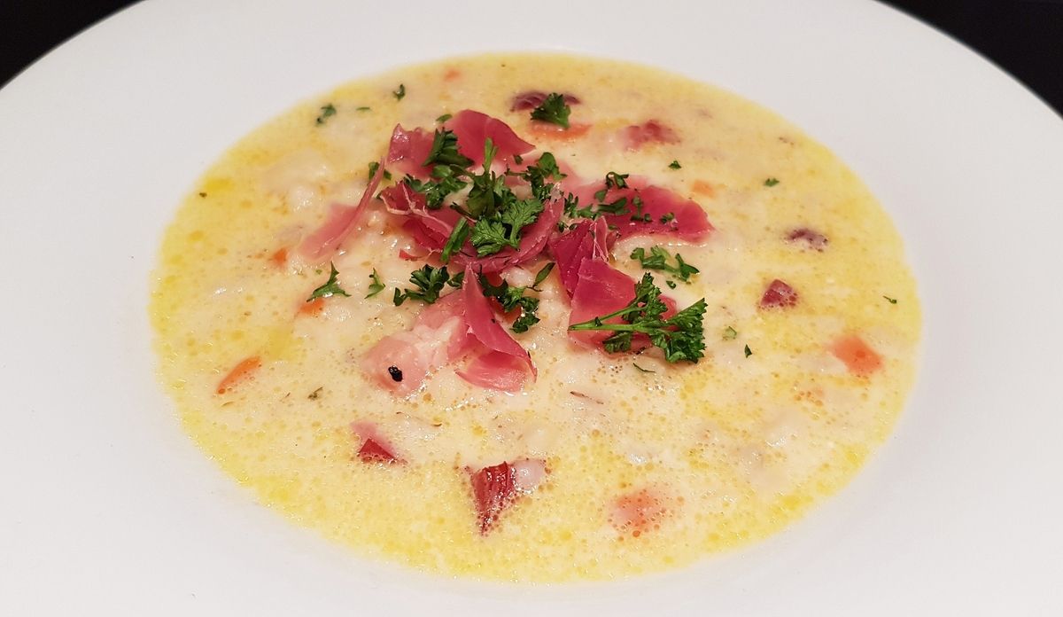 5) Pendant ce temps, hacher le persil et couper la viande des Grisons en petits morceaux. A la fin de la cuisson, ajouter la crème et laisser cuire encore 3 minutes. Goûter et ajouter un peu de sel si nécessaire, mais la soupe devrait être assez salée. Servir dans des assiettes creuses ou des bols et parsemer de persil et de viande des Grisons.