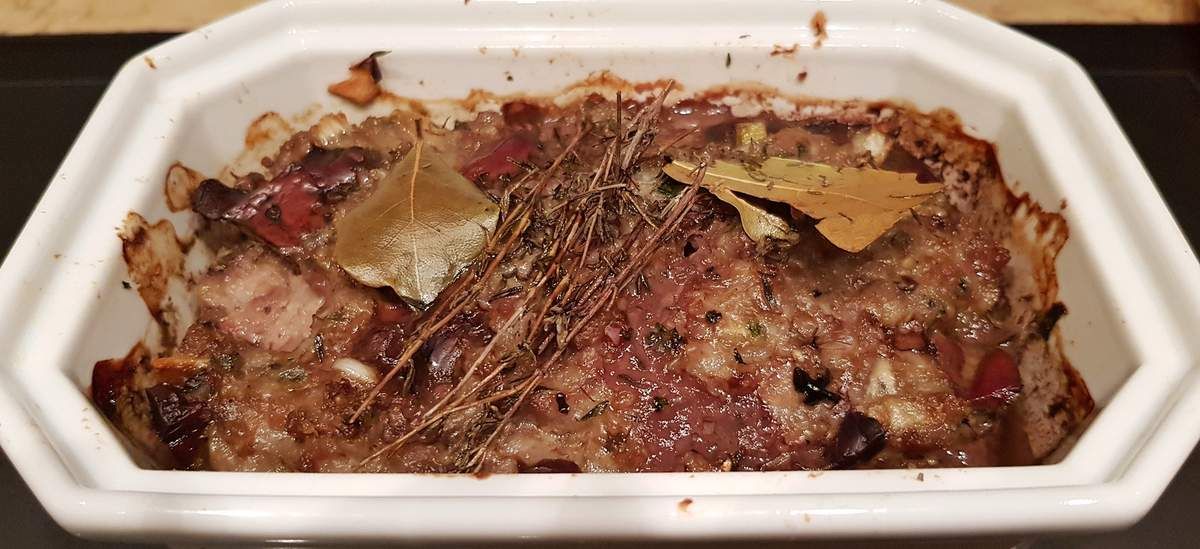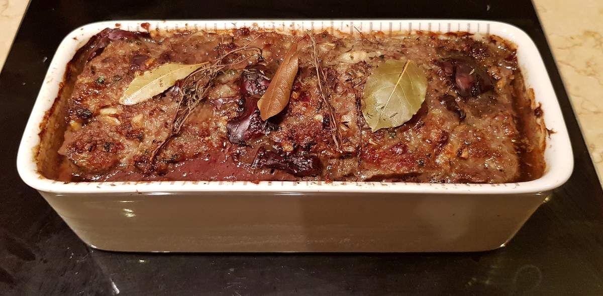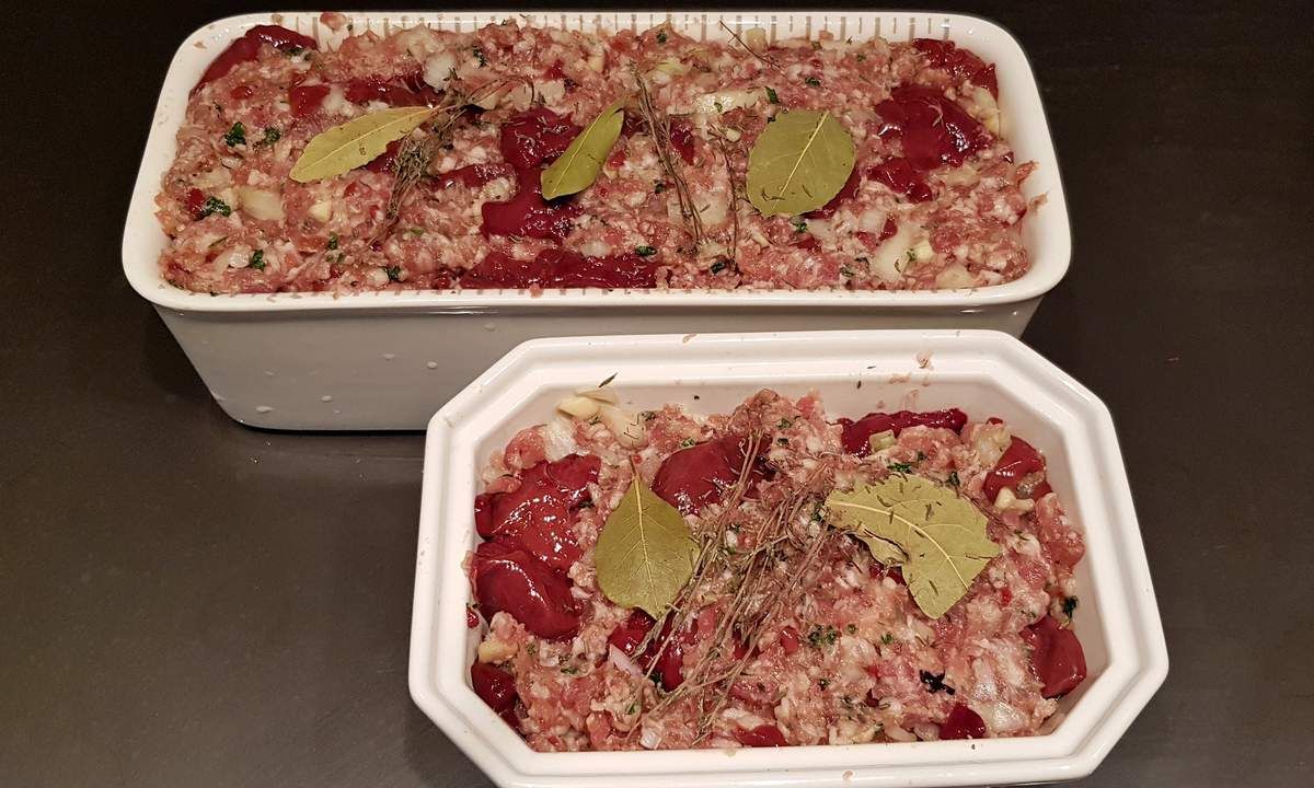 J'ai réalisé une petite et une grande terrine, comme vous pouvez le voir sur les photos. Mais je vous donne les quantités pour la grande terrine de 1,2 litre. Pour la petite, divisez les quantités par deux et comptez 1 heure de cuisson au lieu de 1h30! Et à vous de varier les plaisirs (alcool, épices...)