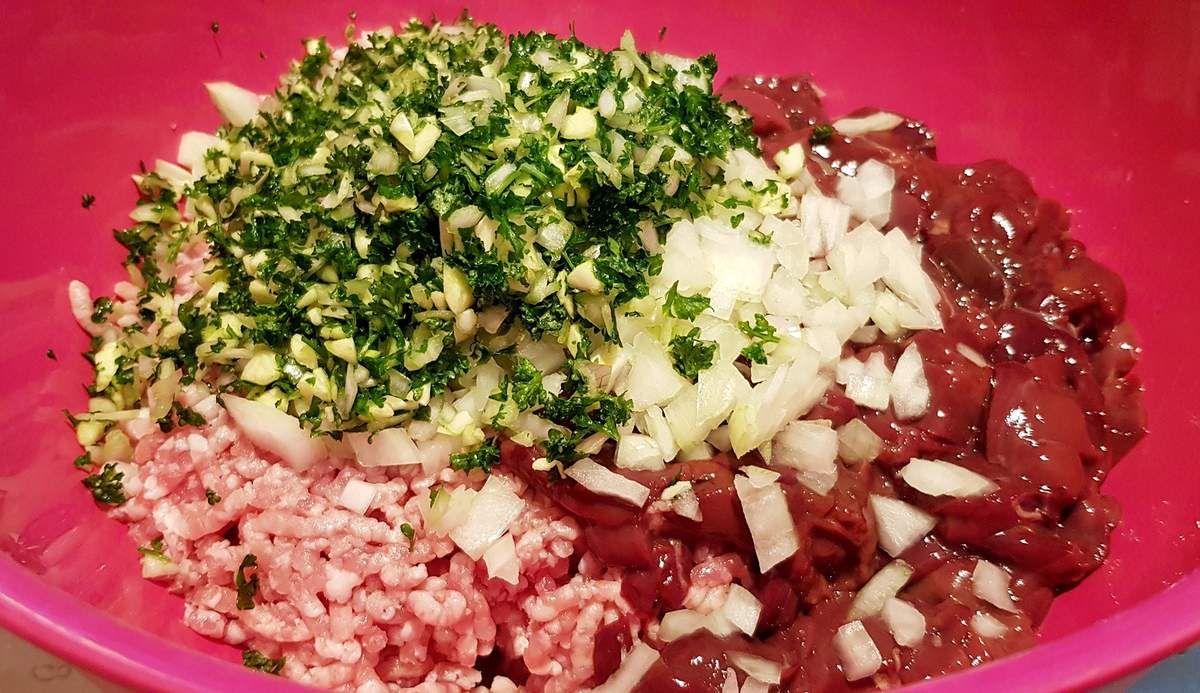 4) Hacher finement oignon, ail, échalotes et persil. Dans un saladier, mettre les viandes, le persil, l'oignon, l'ail, les échalotes, l'Armagnac, le sel et poivrer généreusement. Bien bien mélanger avec les mains.