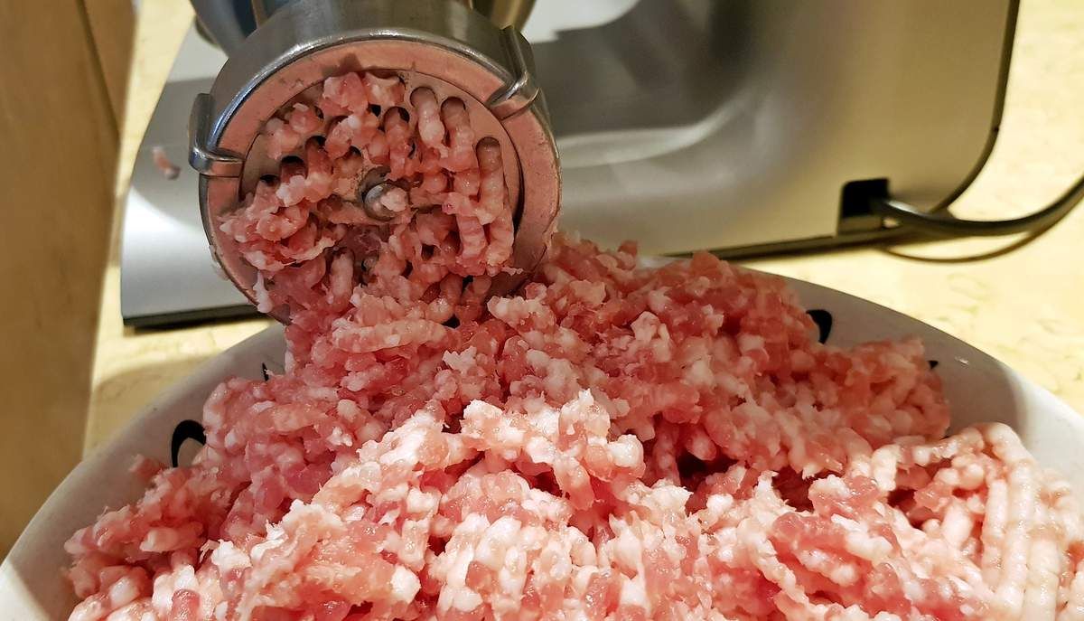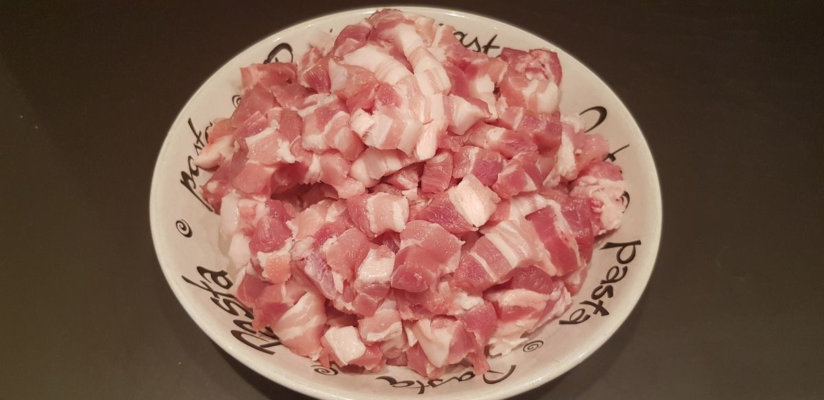 1) Enlever la couenne de la poitrine de porc ainsi que les petits os s'il y en a. Couper en dés puis passer les dés de viande au hachoir à viande.