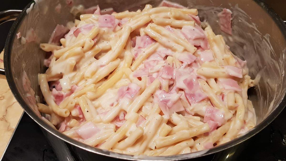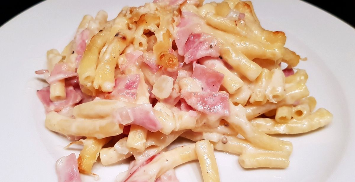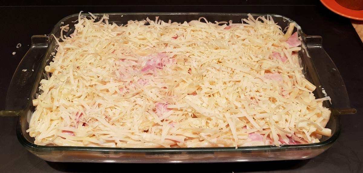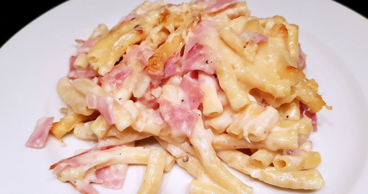 4) Mélanger soigneusement la béchamel aux pâtes, jambon et oignon. Beurrer un plat à gratin et verser les pâtes. Recouvrir du restant de gruyère. Enfourner dans le haut du four pour environ 15 minutes, juste le temps que le dessus gratine légèrement. Sortir du four, laisser reposer 2 minutes et servir avec une salade verte.