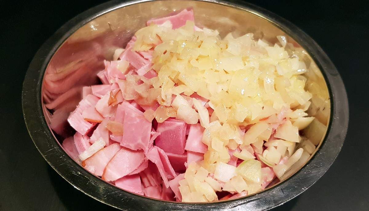 2) Peler et hacher l'oignon et le faire revenir 2 à 3 minutes dans un peu de beurre à rôtir dans une petite casserole ou une poêle. Couper le jambon en petits morceaux. Mettre le jambon et l'oignon avec les pâtes. Râper le gruyère.