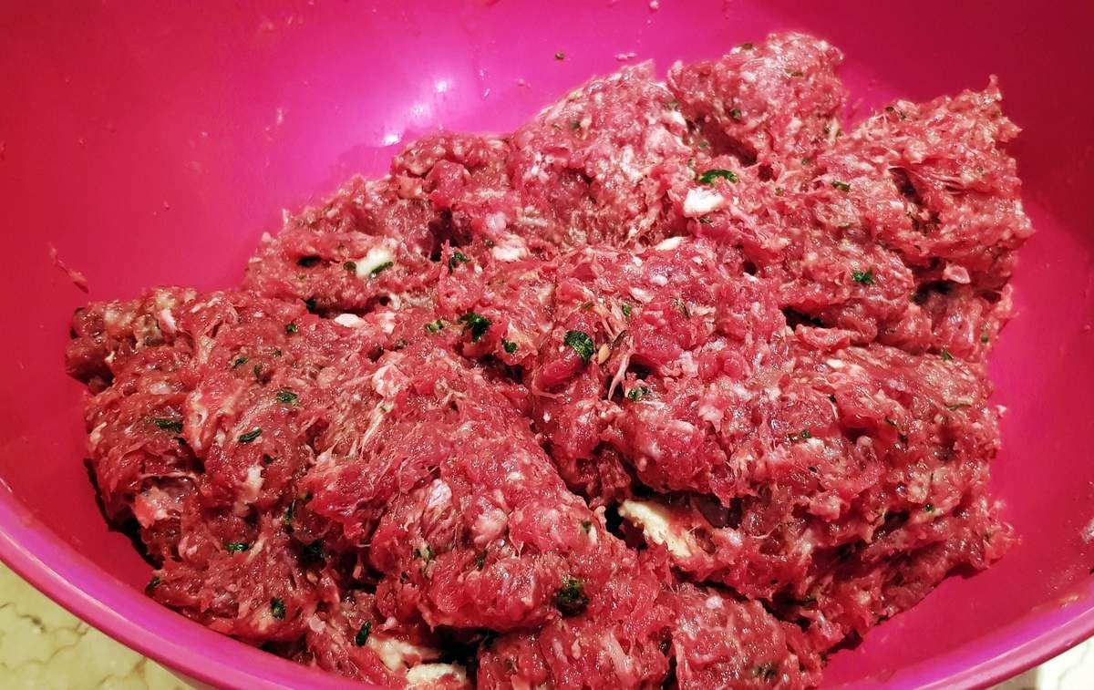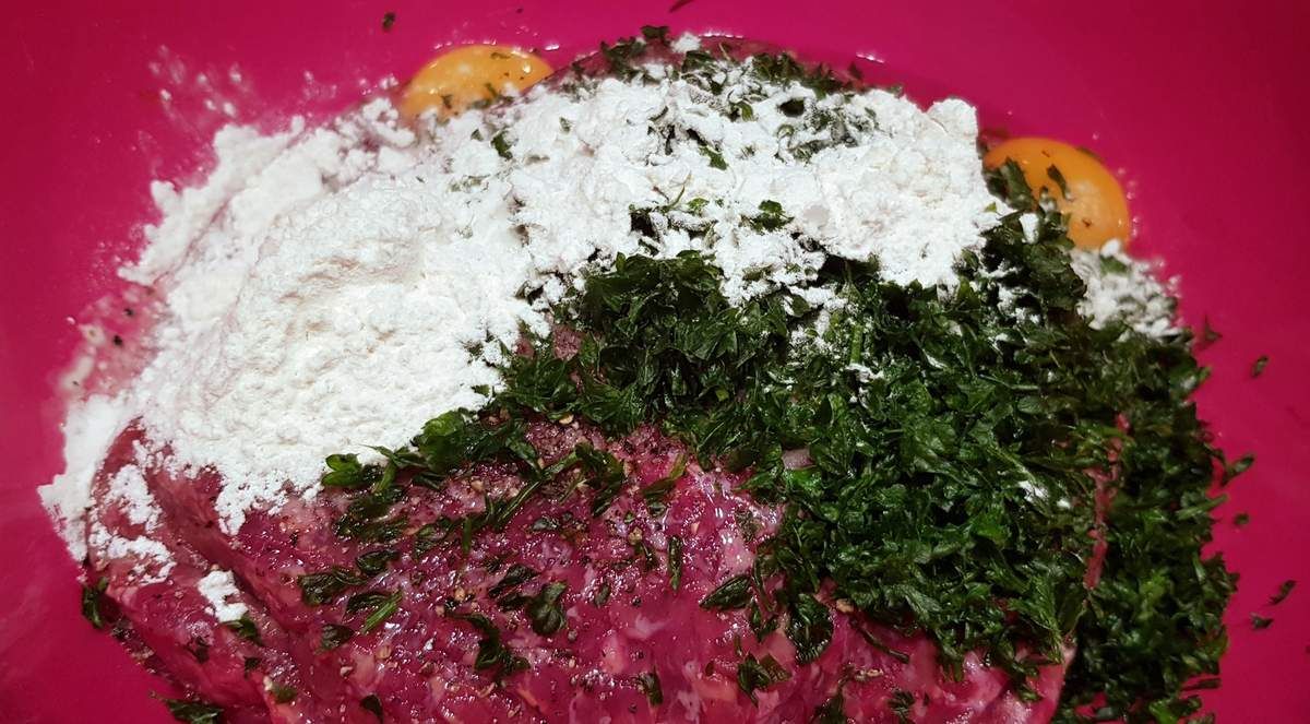 3) Préparer les boulettes pendant ce temps: faire tremper quelques minutes la mie de pain dans un peu de lait. Hacher le persil. Dans un saladier, mettre la viande hachée puis ajouter les oeufs, la mie de pain essorée entre les doigts, le sel, un peu de poivre, la farine et le persil haché. Bien mélanger.