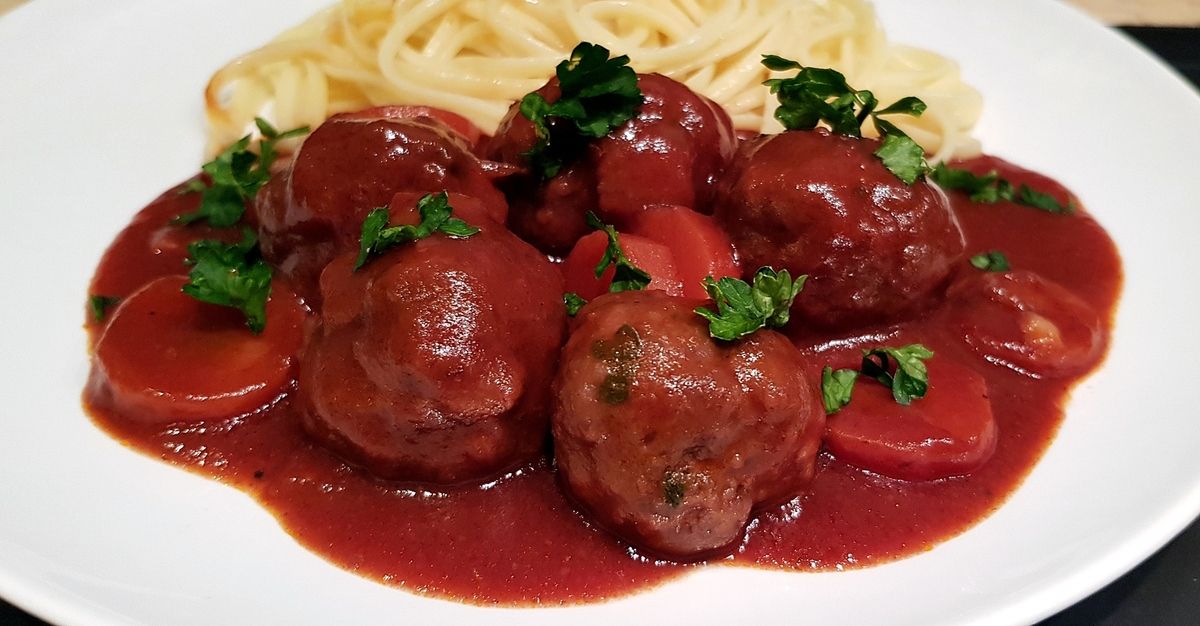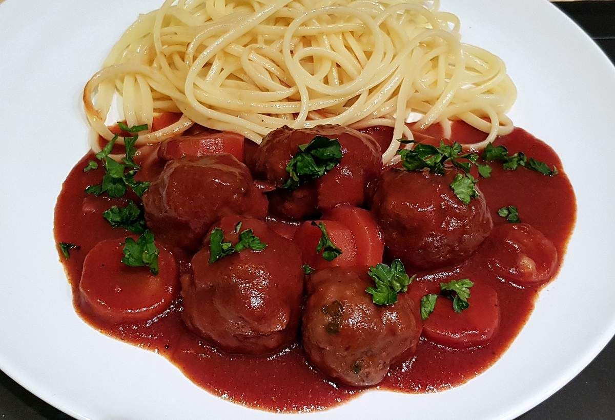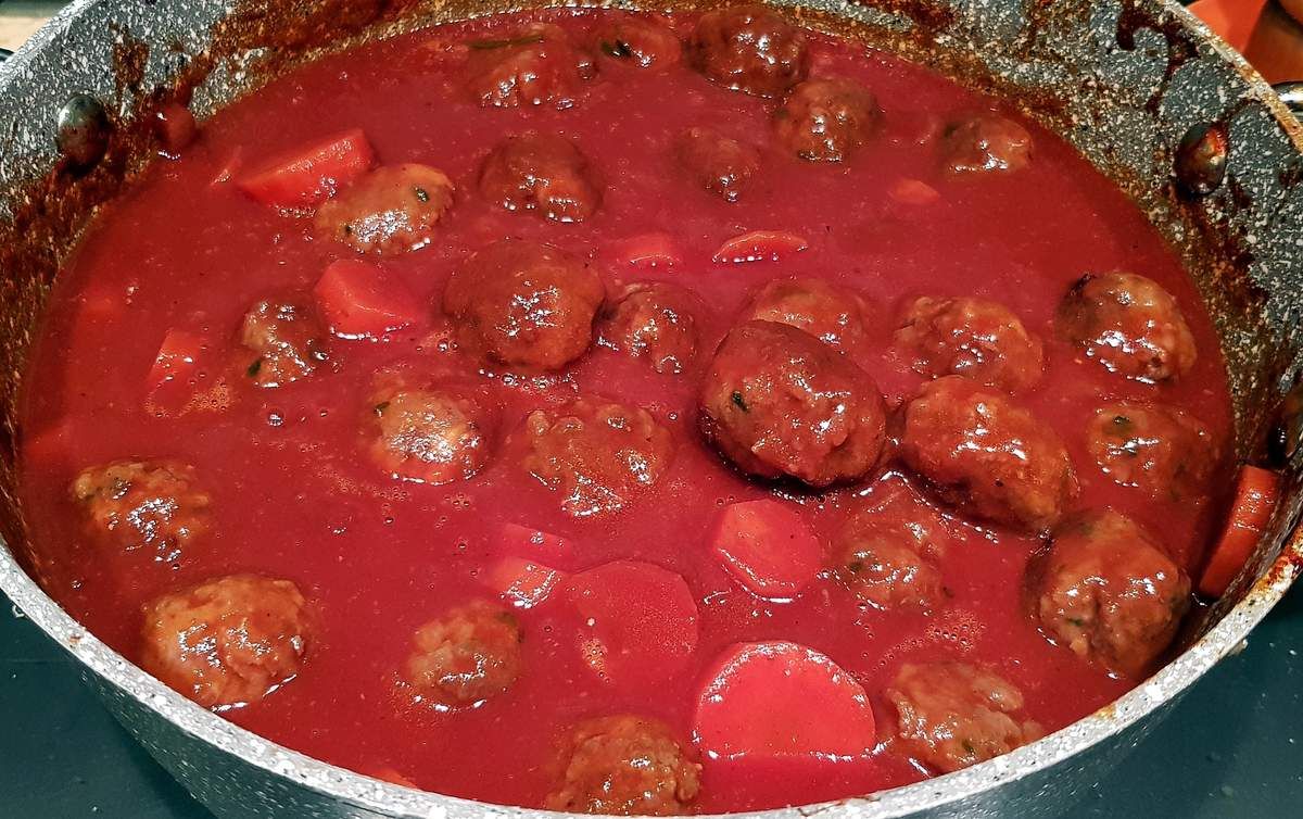6) Après les 45 minutes de cuisson de la sauce du point 2, y intégrer les boulettes et laisser mijoter le tout encore 15 minutes. Goûter et rectifier l'assaisonnement. La sauce doit être onctueuse. Si ce n'est pas la cas, la laisser encore réduire un peu. Servir les boulettes et la sauce avec des pâtes, par exemple.