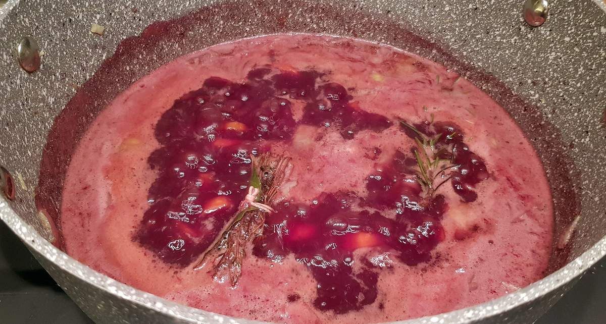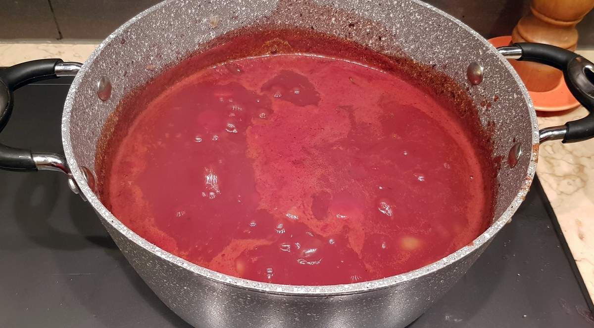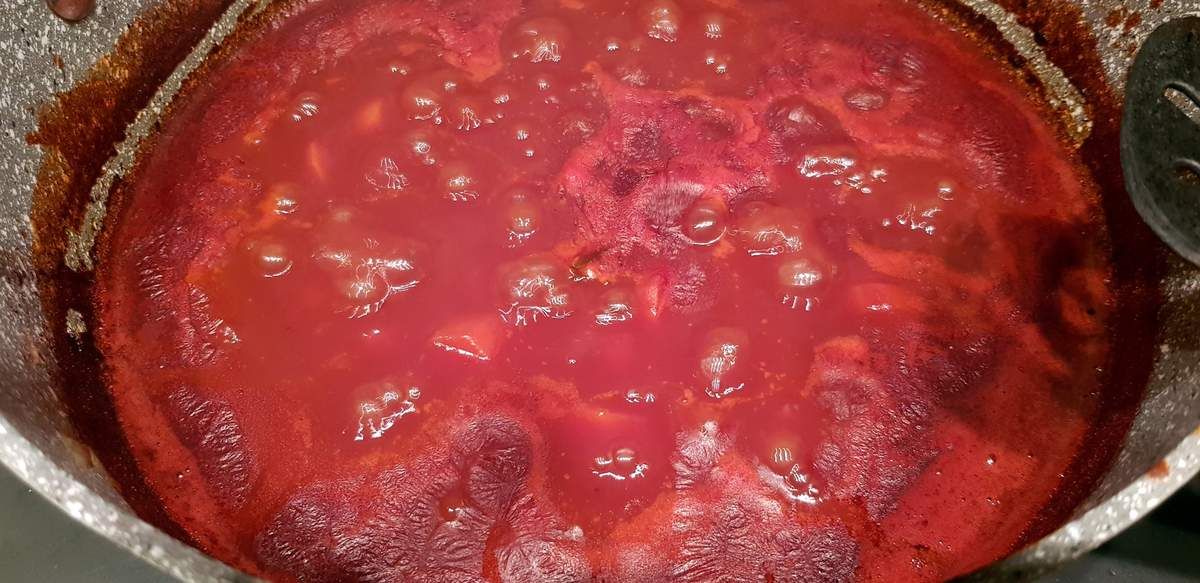2) Dans une cocotte, faire revenir les carottes, l'ail et les oignons quelques minutes dans un peu d'huile à rôtir sur feu moyen. Ajouter 2 càs de farine et bien mélanger jusqu'à ce qu'on ne la voie plus. Ajouter le vin rouge, le bouquet garni, le cube de bouillon de boeuf, la branche de romarin, une bonne pincée de sucre, les deux pincées de paprika. Poivrer. Mélanger et laisser réduire 15 minutes. Après 15 minutes, ajouter la passata de tomates et 4 dl d'eau. Porter à ébullition buis baisser sur feu doux et laisser mijoter 45 minutes en mélangeant de temps en temps.