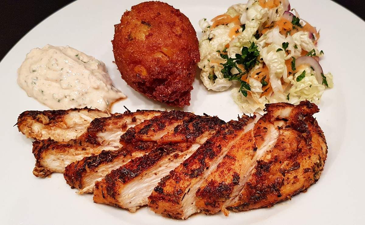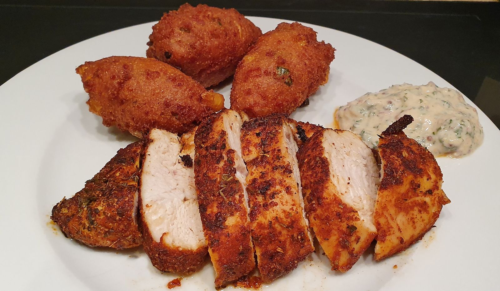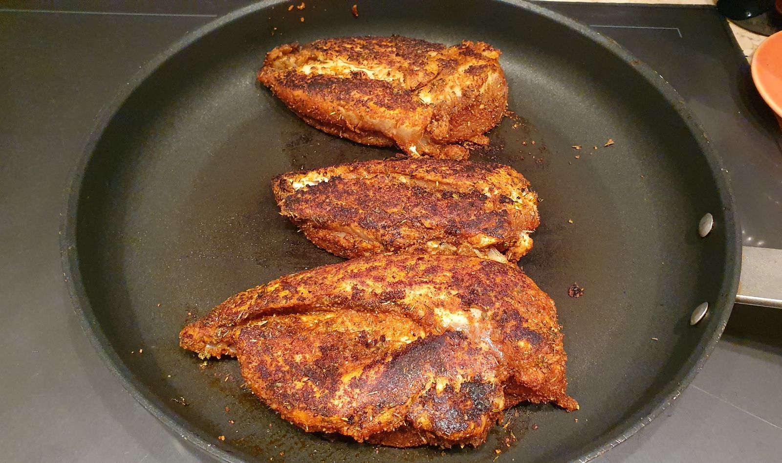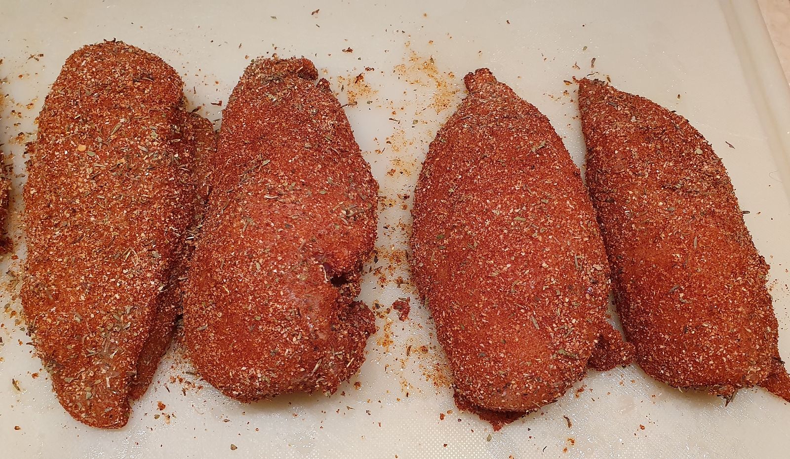 C'est bon, c'est fin, ça se mange sans faim. Léger, plein de saveurs, ce plat va vous donner un joli coup de fouet. Des escalopes de poulet parfaitement cuites, enrobées d'un mélange d'épices à se relever la nuit, bien relevé mais pas trop fort non plus. Ce mélange d'épices, typique de la Louisiane, peut être utilisé avec du poisson par exemple, ou des pommes de terre. Origan, thym, oignon, ail, piment, poivre, sel, paprika. Vous voyez le truc?