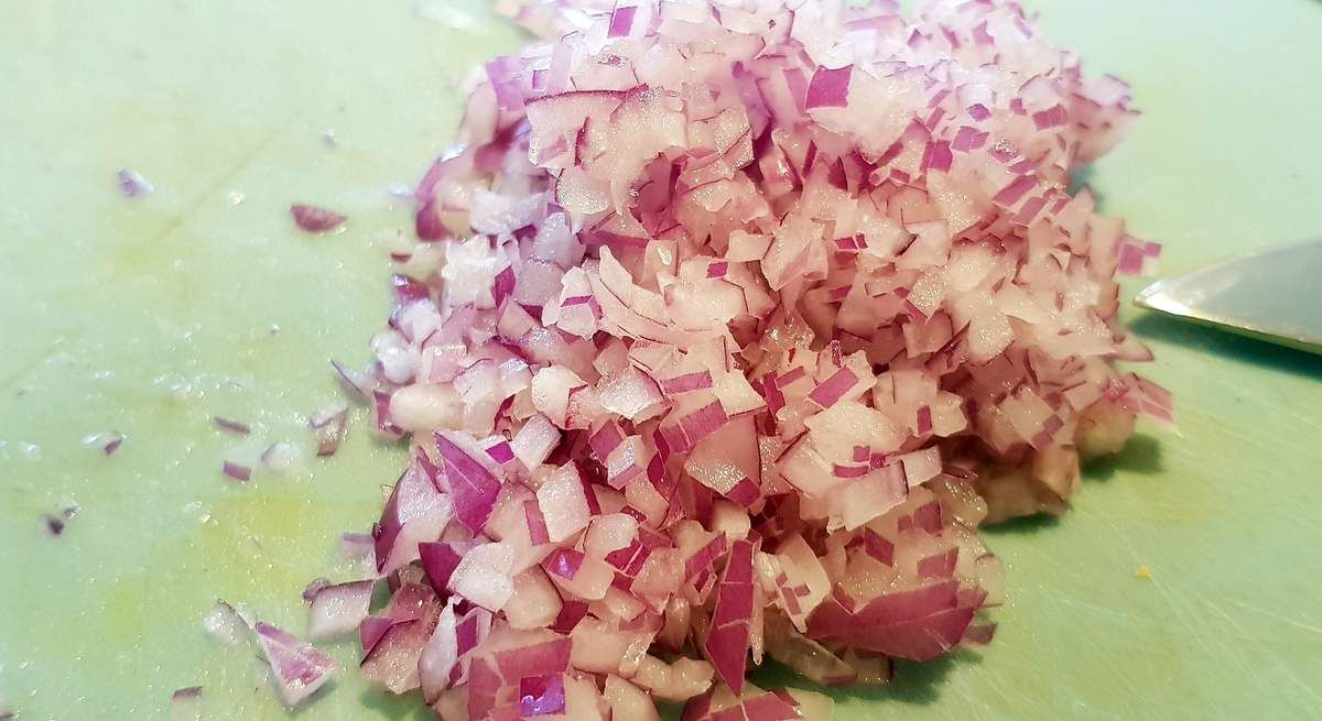 3) Préparer la vinaigrette hacher finement persil et oignon puis les mélanger avec tous les autres ingrédients de la vinaigrette.