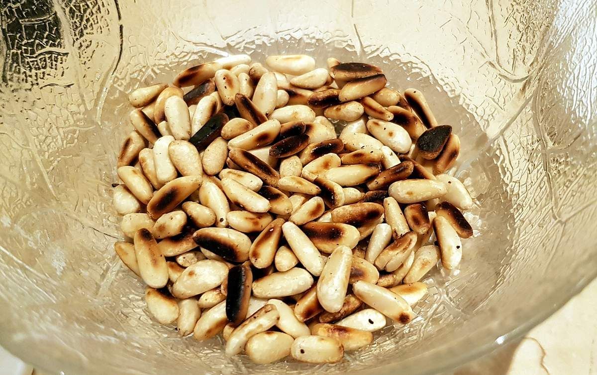 2) Couper la poire en dés après avoir retiré le centre (laisser la peau pour la couleur dans l'assiette). Torréfier dans une poêle sans matière grasse les pignons quelques minutes sur feu moyen et réserver. Couper le reste du fromage réservé en tout petits cubes.