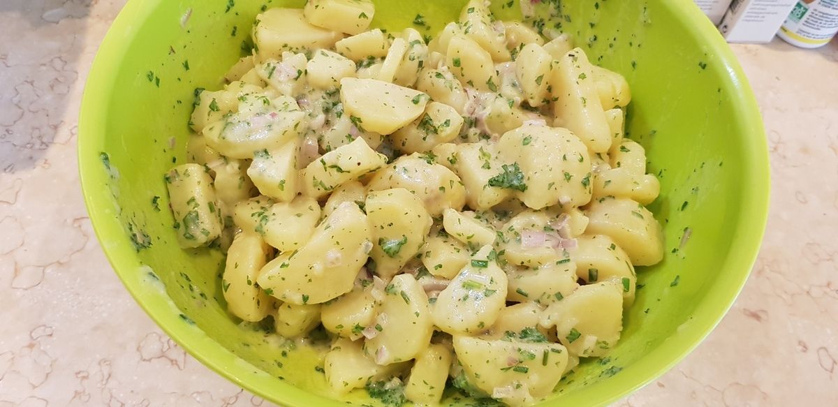 Ma maman s'est souvenue d'une ou deux choses concernant cette fameuse salade de patates. Notamment l'étape cruciale concernant le bouillon chaud à verser sur les patates encore chaudes. Trèèèèèèèès important. Car cela permet aux pommes de terre de pomper le bouillon, ce qui leur donne du fondant et du goût.
