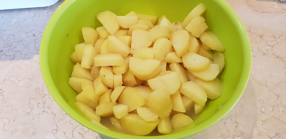 1) Passer les pommes de terre entières et non pelées sous l'eau froide pour les laver puis les plonger dans une casserole d'eau froide. Porter à ébullition puis baisser le feu et les laisser cuire environ 20 à 25 minutes suivant leur grosseur. Elles doivent être cuites. Pour vérifier, planter la lame d'un couteau dans une pomme de terre qui doit s'enfoncer et ressortir facilement. Egoutter et laisser brièvement tiédir puis les peler (oui je sais c'est chaud). Faire chauffer parallèlement 2 décilitres d'eau avec le cube de bouillon. Couper les pommes de terre en deux puis en demi-rondelles épaisses et les mettre dans un plat. Verser le bouillon chaud sur les pommes de terre chaudes et laisser pomper pendant 30 minutes en mélangeant de temps en temps très délicatement.