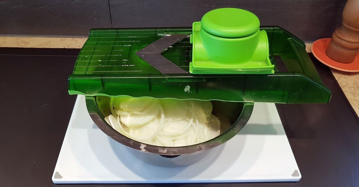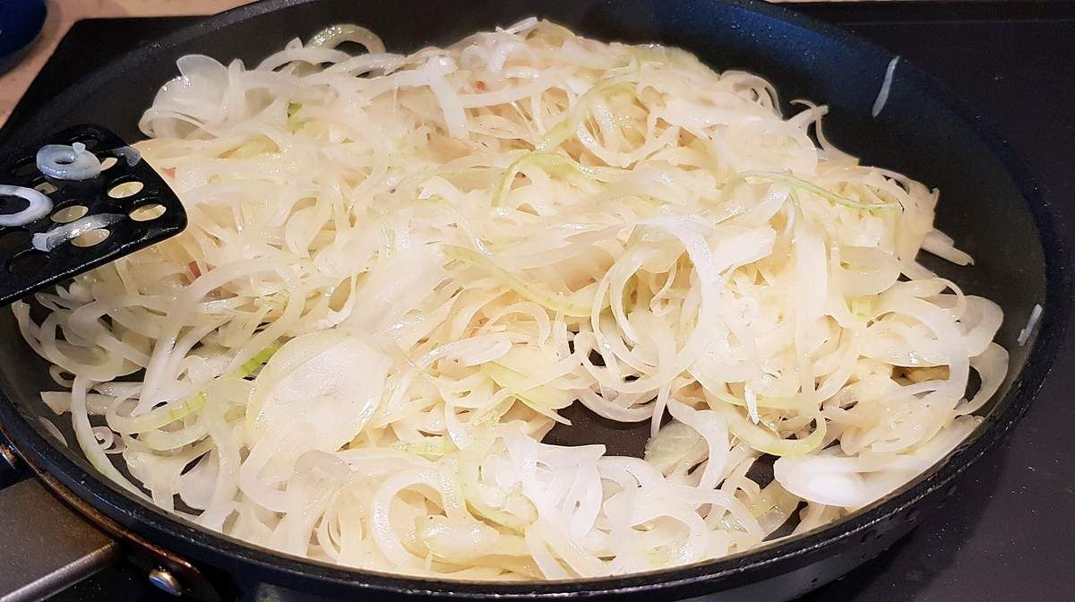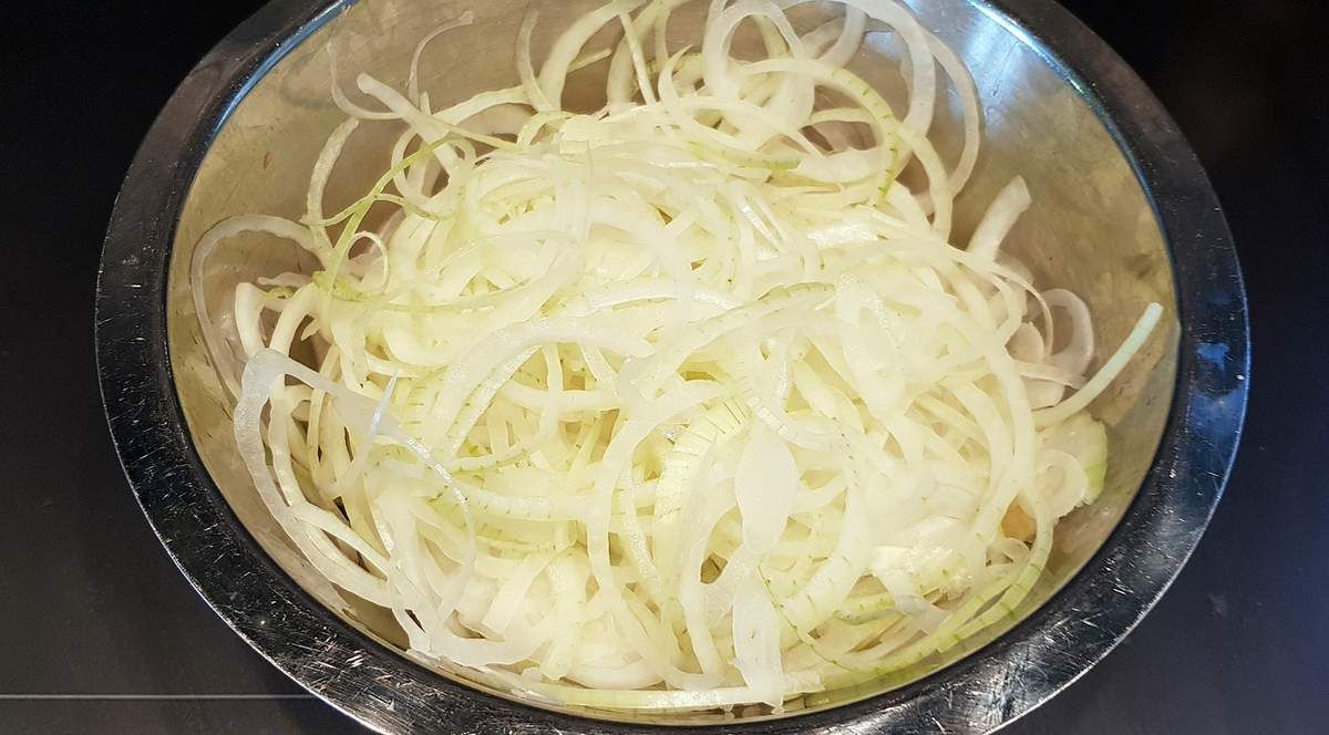 2) Peler et couper les oignons en deux puis les émincer en demi-rondelles finement. L'astuce: utiliser une mandoline. Dans une poêle, mettre à fondre le beurre et faire revenir les oignons en mélangeant quelques minutes sur feu moyen. Ils doivent juste tomber, pas besoin qu'ils soient totalement cuits et tendres. Réserver.